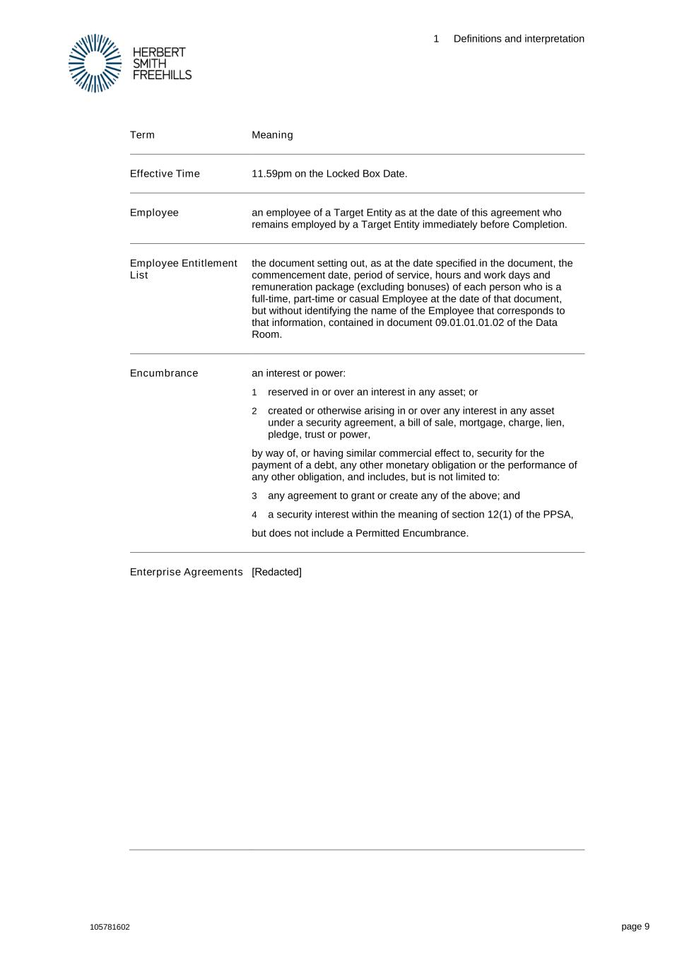 1 Definitions and interpretation 105781602 page 9 Term Meaning Effective Time 11.59pm on the Locked Box Date. Employee an employee of a Target Entity as at the date of this agreement who remains employed by a Target Entity immediately before Completion. Employee Entitlement List the document setting out, as at the date specified in the document, the commencement date, period of service, hours and work days and remuneration package (excluding bonuses) of each person who is a full-time, part-time or casual Employee at the date of that document, but without identifying the name of the Employee that corresponds to that information, contained in document 09.01.01.01.02 of the Data Room. Encumbrance an interest or power: 1 reserved in or over an interest in any asset; or 2 created or otherwise arising in or over any interest in any asset under a security agreement, a bill of sale, mortgage, charge, lien, pledge, trust or power, by way of, or having similar commercial effect to, security for the payment of a debt, any other monetary obligation or the performance of any other obligation, and includes, but is not limited to: 3 any agreement to grant or create any of the above; and 4 a security interest within the meaning of section 12(1) of the PPSA, but does not include a Permitted Encumbrance. Enterprise Agreements [Redacted]