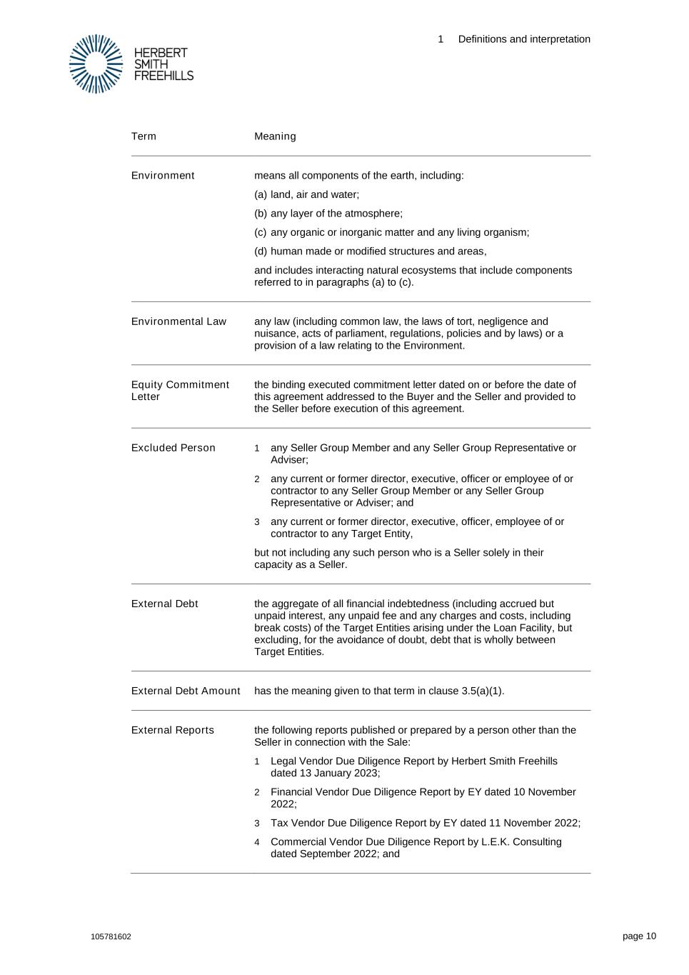 1 Definitions and interpretation 105781602 page 10 Term Meaning Environment means all components of the earth, including: (a) land, air and water; (b) any layer of the atmosphere; (c) any organic or inorganic matter and any living organism; (d) human made or modified structures and areas, and includes interacting natural ecosystems that include components referred to in paragraphs (a) to (c). Environmental Law any law (including common law, the laws of tort, negligence and nuisance, acts of parliament, regulations, policies and by laws) or a provision of a law relating to the Environment. Equity Commitment Letter the binding executed commitment letter dated on or before the date of this agreement addressed to the Buyer and the Seller and provided to the Seller before execution of this agreement. Excluded Person 1 any Seller Group Member and any Seller Group Representative or Adviser; 2 any current or former director, executive, officer or employee of or contractor to any Seller Group Member or any Seller Group Representative or Adviser; and 3 any current or former director, executive, officer, employee of or contractor to any Target Entity, but not including any such person who is a Seller solely in their capacity as a Seller. External Debt the aggregate of all financial indebtedness (including accrued but unpaid interest, any unpaid fee and any charges and costs, including break costs) of the Target Entities arising under the Loan Facility, but excluding, for the avoidance of doubt, debt that is wholly between Target Entities. External Debt Amount has the meaning given to that term in clause 3.5(a)(1). External Reports the following reports published or prepared by a person other than the Seller in connection with the Sale: 1 Legal Vendor Due Diligence Report by Herbert Smith Freehills dated 13 January 2023; 2 Financial Vendor Due Diligence Report by EY dated 10 November 2022; 3 Tax Vendor Due Diligence Report by EY dated 11 November 2022; 4 Commercial Vendor Due Diligence Report by L.E.K. Consulting dated September 2022; and