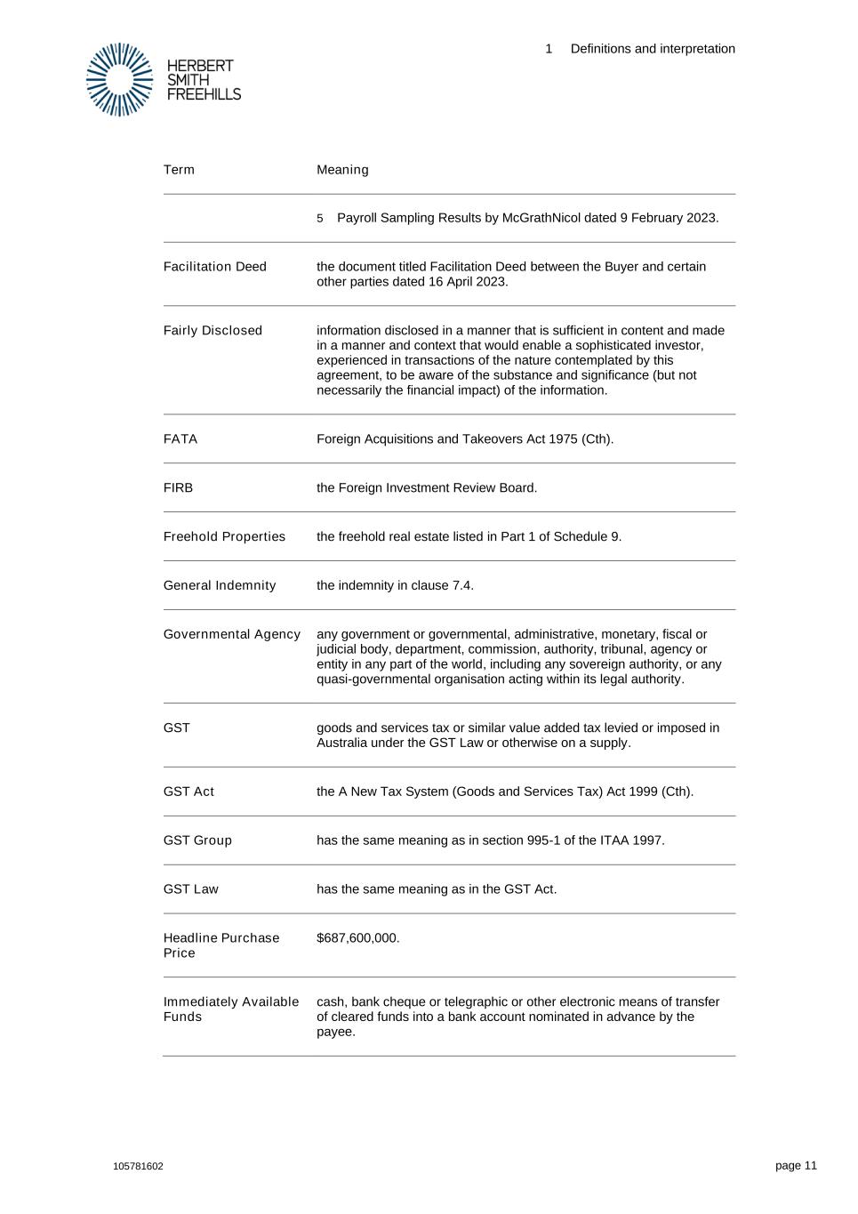 1 Definitions and interpretation 105781602 page 11 Term Meaning 5 Payroll Sampling Results by McGrathNicol dated 9 February 2023. Facilitation Deed the document titled Facilitation Deed between the Buyer and certain other parties dated 16 April 2023. Fairly Disclosed information disclosed in a manner that is sufficient in content and made in a manner and context that would enable a sophisticated investor, experienced in transactions of the nature contemplated by this agreement, to be aware of the substance and significance (but not necessarily the financial impact) of the information. FATA Foreign Acquisitions and Takeovers Act 1975 (Cth). FIRB the Foreign Investment Review Board. Freehold Properties the freehold real estate listed in Part 1 of Schedule 9. General Indemnity the indemnity in clause 7.4. Governmental Agency any government or governmental, administrative, monetary, fiscal or judicial body, department, commission, authority, tribunal, agency or entity in any part of the world, including any sovereign authority, or any quasi-governmental organisation acting within its legal authority. GST goods and services tax or similar value added tax levied or imposed in Australia under the GST Law or otherwise on a supply. GST Act the A New Tax System (Goods and Services Tax) Act 1999 (Cth). GST Group has the same meaning as in section 995-1 of the ITAA 1997. GST Law has the same meaning as in the GST Act. Headline Purchase Price $687,600,000. Immediately Available Funds cash, bank cheque or telegraphic or other electronic means of transfer of cleared funds into a bank account nominated in advance by the payee.