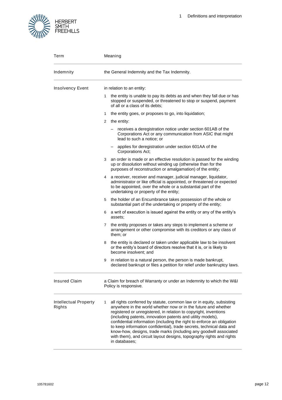 1 Definitions and interpretation 105781602 page 12 Term Meaning Indemnity the General Indemnity and the Tax Indemnity. Insolvency Event in relation to an entity: 1 the entity is unable to pay its debts as and when they fall due or has stopped or suspended, or threatened to stop or suspend, payment of all or a class of its debts; 1 the entity goes, or proposes to go, into liquidation; 2 the entity: – receives a deregistration notice under section 601AB of the Corporations Act or any communication from ASIC that might lead to such a notice; or – applies for deregistration under section 601AA of the Corporations Act; 3 an order is made or an effective resolution is passed for the winding up or dissolution without winding up (otherwise than for the purposes of reconstruction or amalgamation) of the entity; 4 a receiver, receiver and manager, judicial manager, liquidator, administrator or like official is appointed, or threatened or expected to be appointed, over the whole or a substantial part of the undertaking or property of the entity; 5 the holder of an Encumbrance takes possession of the whole or substantial part of the undertaking or property of the entity; 6 a writ of execution is issued against the entity or any of the entity’s assets; 7 the entity proposes or takes any steps to implement a scheme or arrangement or other compromise with its creditors or any class of them; or 8 the entity is declared or taken under applicable law to be insolvent or the entity’s board of directors resolve that it is, or is likely to become insolvent; and 9 in relation to a natural person, the person is made bankrupt, declared bankrupt or files a petition for relief under bankruptcy laws. Insured Claim a Claim for breach of Warranty or under an Indemnity to which the W&I Policy is responsive. Intellectual Property Rights 1 all rights conferred by statute, common law or in equity, subsisting anywhere in the world whether now or in the future and whether registered or unregistered, in relation to copyright, inventions (including patents, innovation patents and utility models), confidential information (including the right to enforce an obligation to keep information confidential), trade secrets, technical data and know-how, designs, trade marks (including any goodwill associated with them), and circuit layout designs, topography rights and rights in databases;