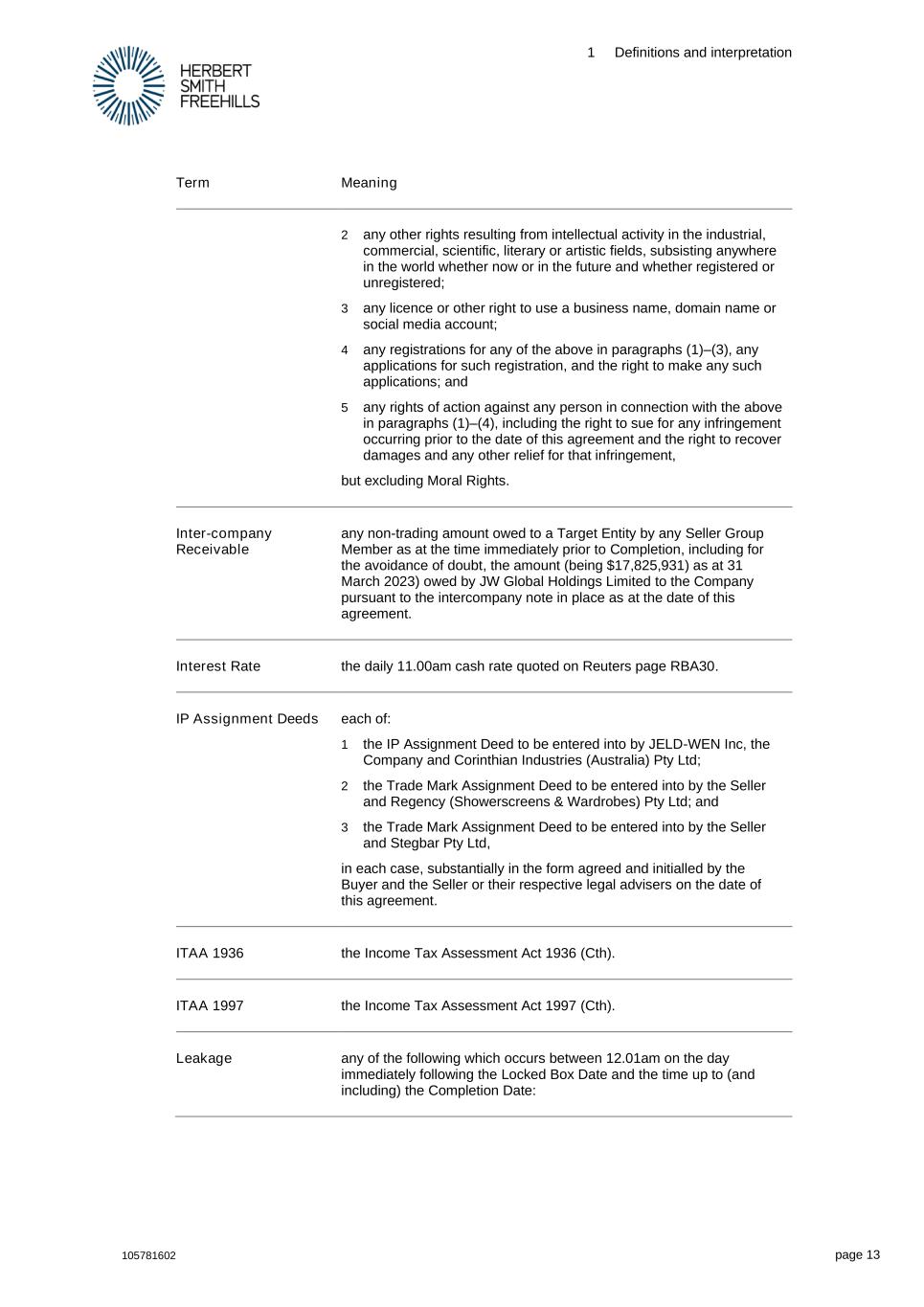 1 Definitions and interpretation 105781602 page 13 Term Meaning 2 any other rights resulting from intellectual activity in the industrial, commercial, scientific, literary or artistic fields, subsisting anywhere in the world whether now or in the future and whether registered or unregistered; 3 any licence or other right to use a business name, domain name or social media account; 4 any registrations for any of the above in paragraphs (1)–(3), any applications for such registration, and the right to make any such applications; and 5 any rights of action against any person in connection with the above in paragraphs (1)–(4), including the right to sue for any infringement occurring prior to the date of this agreement and the right to recover damages and any other relief for that infringement, but excluding Moral Rights. Inter-company Receivable any non-trading amount owed to a Target Entity by any Seller Group Member as at the time immediately prior to Completion, including for the avoidance of doubt, the amount (being $17,825,931) as at 31 March 2023) owed by JW Global Holdings Limited to the Company pursuant to the intercompany note in place as at the date of this agreement. Interest Rate the daily 11.00am cash rate quoted on Reuters page RBA30. IP Assignment Deeds each of: 1 the IP Assignment Deed to be entered into by JELD-WEN Inc, the Company and Corinthian Industries (Australia) Pty Ltd; 2 the Trade Mark Assignment Deed to be entered into by the Seller and Regency (Showerscreens & Wardrobes) Pty Ltd; and 3 the Trade Mark Assignment Deed to be entered into by the Seller and Stegbar Pty Ltd, in each case, substantially in the form agreed and initialled by the Buyer and the Seller or their respective legal advisers on the date of this agreement. ITAA 1936 the Income Tax Assessment Act 1936 (Cth). ITAA 1997 the Income Tax Assessment Act 1997 (Cth). Leakage any of the following which occurs between 12.01am on the day immediately following the Locked Box Date and the time up to (and including) the Completion Date: