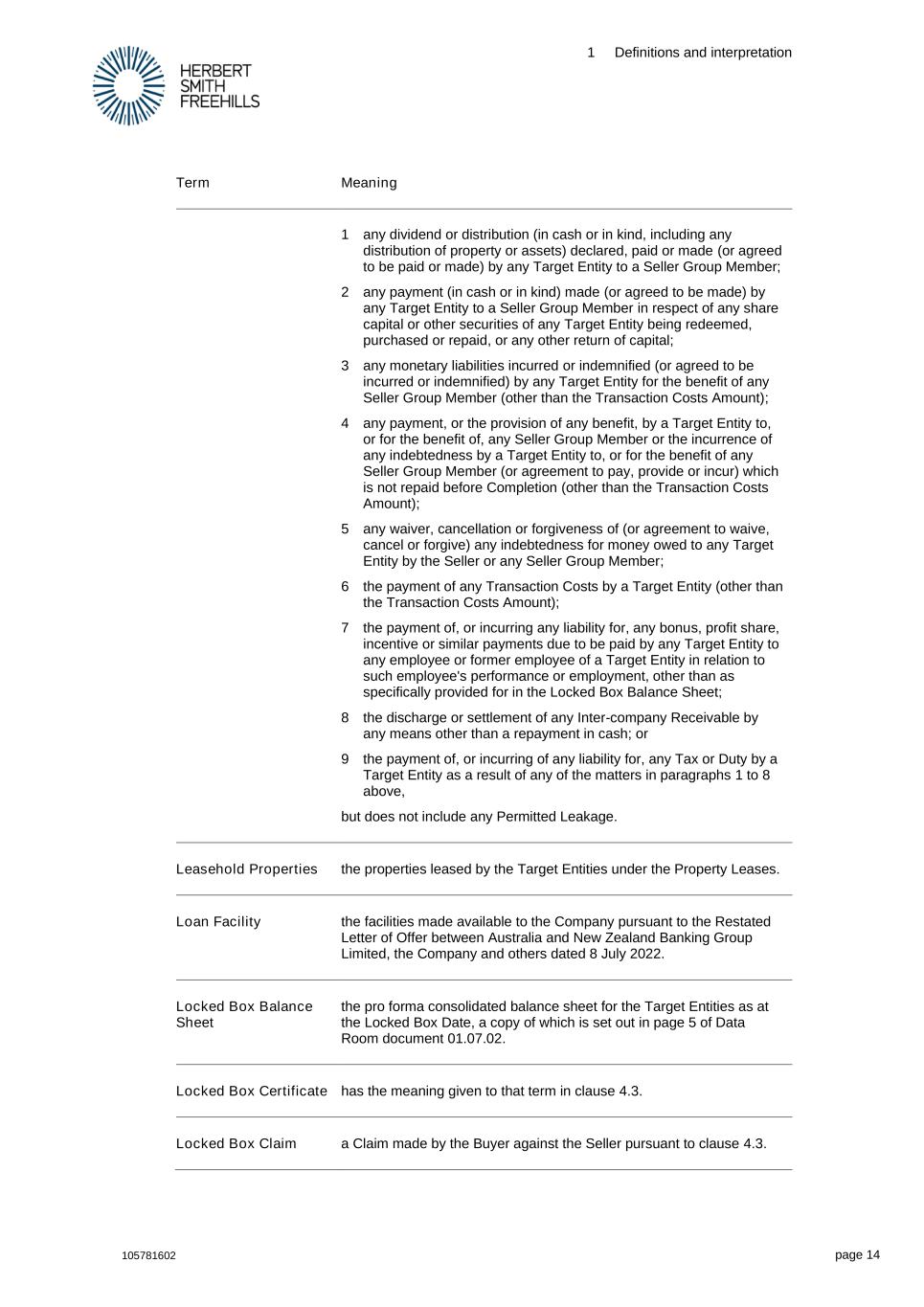 1 Definitions and interpretation 105781602 page 14 Term Meaning 1 any dividend or distribution (in cash or in kind, including any distribution of property or assets) declared, paid or made (or agreed to be paid or made) by any Target Entity to a Seller Group Member; 2 any payment (in cash or in kind) made (or agreed to be made) by any Target Entity to a Seller Group Member in respect of any share capital or other securities of any Target Entity being redeemed, purchased or repaid, or any other return of capital; 3 any monetary liabilities incurred or indemnified (or agreed to be incurred or indemnified) by any Target Entity for the benefit of any Seller Group Member (other than the Transaction Costs Amount); 4 any payment, or the provision of any benefit, by a Target Entity to, or for the benefit of, any Seller Group Member or the incurrence of any indebtedness by a Target Entity to, or for the benefit of any Seller Group Member (or agreement to pay, provide or incur) which is not repaid before Completion (other than the Transaction Costs Amount); 5 any waiver, cancellation or forgiveness of (or agreement to waive, cancel or forgive) any indebtedness for money owed to any Target Entity by the Seller or any Seller Group Member; 6 the payment of any Transaction Costs by a Target Entity (other than the Transaction Costs Amount); 7 the payment of, or incurring any liability for, any bonus, profit share, incentive or similar payments due to be paid by any Target Entity to any employee or former employee of a Target Entity in relation to such employee's performance or employment, other than as specifically provided for in the Locked Box Balance Sheet; 8 the discharge or settlement of any Inter-company Receivable by any means other than a repayment in cash; or 9 the payment of, or incurring of any liability for, any Tax or Duty by a Target Entity as a result of any of the matters in paragraphs 1 to 8 above, but does not include any Permitted Leakage. Leasehold Properties the properties leased by the Target Entities under the Property Leases. Loan Facility the facilities made available to the Company pursuant to the Restated Letter of Offer between Australia and New Zealand Banking Group Limited, the Company and others dated 8 July 2022. Locked Box Balance Sheet the pro forma consolidated balance sheet for the Target Entities as at the Locked Box Date, a copy of which is set out in page 5 of Data Room document 01.07.02. Locked Box Certificate has the meaning given to that term in clause 4.3. Locked Box Claim a Claim made by the Buyer against the Seller pursuant to clause 4.3.