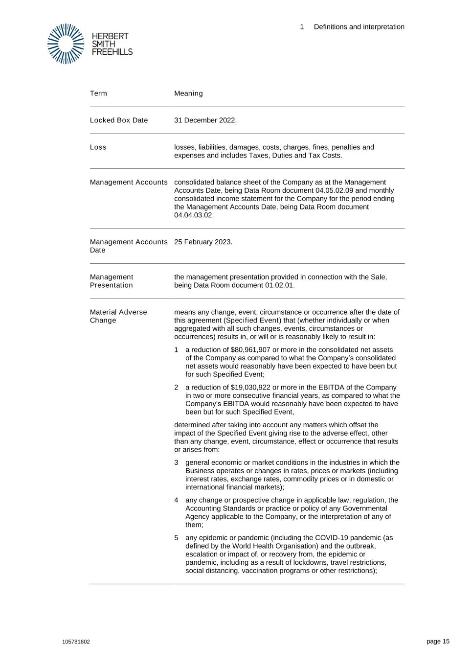 1 Definitions and interpretation 105781602 page 15 Term Meaning Locked Box Date 31 December 2022. Loss losses, liabilities, damages, costs, charges, fines, penalties and expenses and includes Taxes, Duties and Tax Costs. Management Accounts consolidated balance sheet of the Company as at the Management Accounts Date, being Data Room document 04.05.02.09 and monthly consolidated income statement for the Company for the period ending the Management Accounts Date, being Data Room document 04.04.03.02. Management Accounts Date 25 February 2023. Management Presentation the management presentation provided in connection with the Sale, being Data Room document 01.02.01. Material Adverse Change means any change, event, circumstance or occurrence after the date of this agreement (Specified Event) that (whether individually or when aggregated with all such changes, events, circumstances or occurrences) results in, or will or is reasonably likely to result in: 1 a reduction of $80,961,907 or more in the consolidated net assets of the Company as compared to what the Company’s consolidated net assets would reasonably have been expected to have been but for such Specified Event; 2 a reduction of $19,030,922 or more in the EBITDA of the Company in two or more consecutive financial years, as compared to what the Company’s EBITDA would reasonably have been expected to have been but for such Specified Event, determined after taking into account any matters which offset the impact of the Specified Event giving rise to the adverse effect, other than any change, event, circumstance, effect or occurrence that results or arises from: 3 general economic or market conditions in the industries in which the Business operates or changes in rates, prices or markets (including interest rates, exchange rates, commodity prices or in domestic or international financial markets); 4 any change or prospective change in applicable law, regulation, the Accounting Standards or practice or policy of any Governmental Agency applicable to the Company, or the interpretation of any of them; 5 any epidemic or pandemic (including the COVID-19 pandemic (as defined by the World Health Organisation) and the outbreak, escalation or impact of, or recovery from, the epidemic or pandemic, including as a result of lockdowns, travel restrictions, social distancing, vaccination programs or other restrictions);