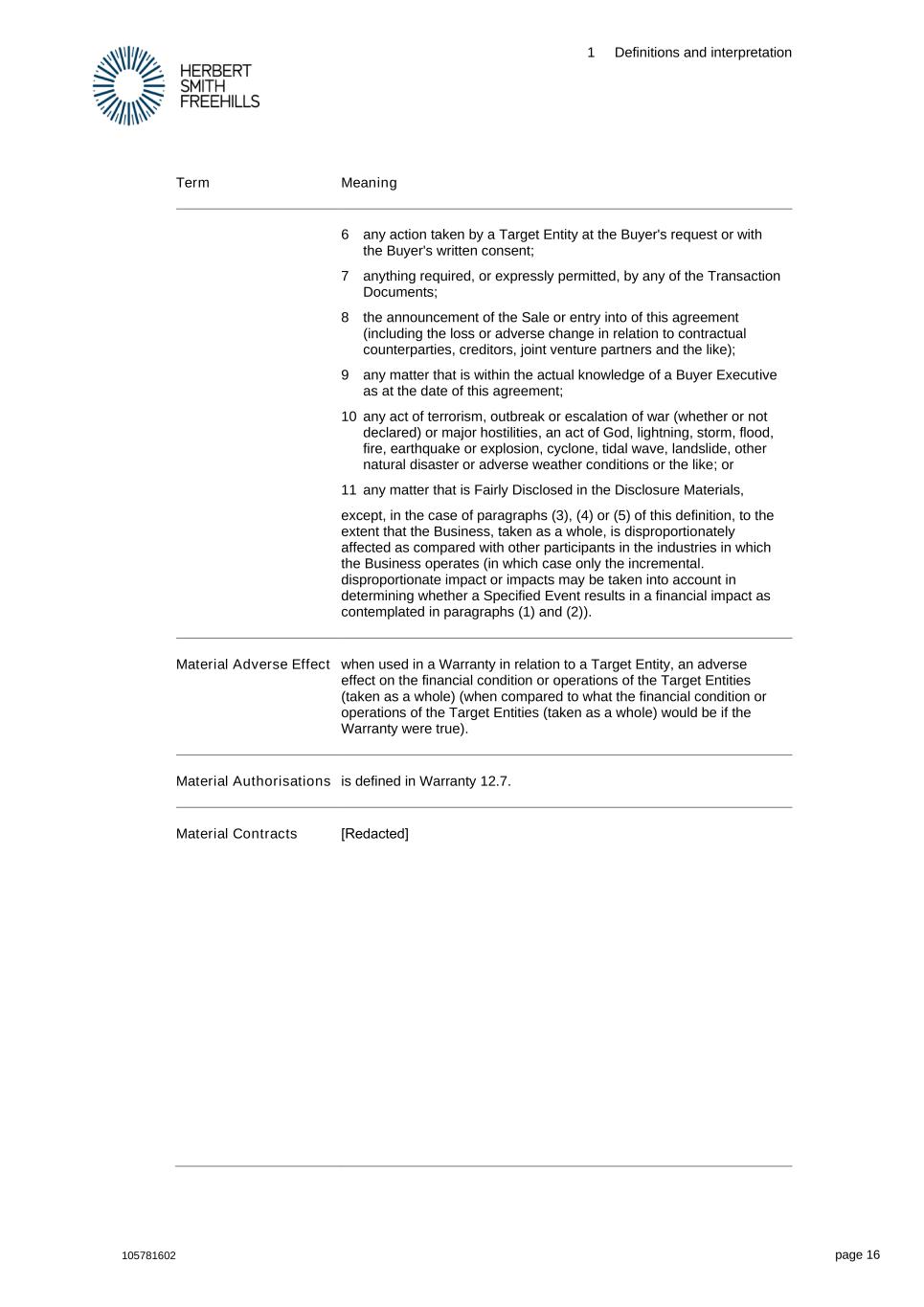 1 Definitions and interpretation 105781602 page 16 Term Meaning 6 any action taken by a Target Entity at the Buyer's request or with the Buyer's written consent; 7 anything required, or expressly permitted, by any of the Transaction Documents; 8 the announcement of the Sale or entry into of this agreement (including the loss or adverse change in relation to contractual counterparties, creditors, joint venture partners and the like); 9 any matter that is within the actual knowledge of a Buyer Executive as at the date of this agreement; 10 any act of terrorism, outbreak or escalation of war (whether or not declared) or major hostilities, an act of God, lightning, storm, flood, fire, earthquake or explosion, cyclone, tidal wave, landslide, other natural disaster or adverse weather conditions or the like; or 11 any matter that is Fairly Disclosed in the Disclosure Materials, except, in the case of paragraphs (3), (4) or (5) of this definition, to the extent that the Business, taken as a whole, is disproportionately affected as compared with other participants in the industries in which the Business operates (in which case only the incremental. disproportionate impact or impacts may be taken into account in determining whether a Specified Event results in a financial impact as contemplated in paragraphs (1) and (2)). Material Adverse Effect when used in a Warranty in relation to a Target Entity, an adverse effect on the financial condition or operations of the Target Entities (taken as a whole) (when compared to what the financial condition or operations of the Target Entities (taken as a whole) would be if the Warranty were true). Material Authorisations is defined in Warranty 12.7. Material Contracts [Redacted]