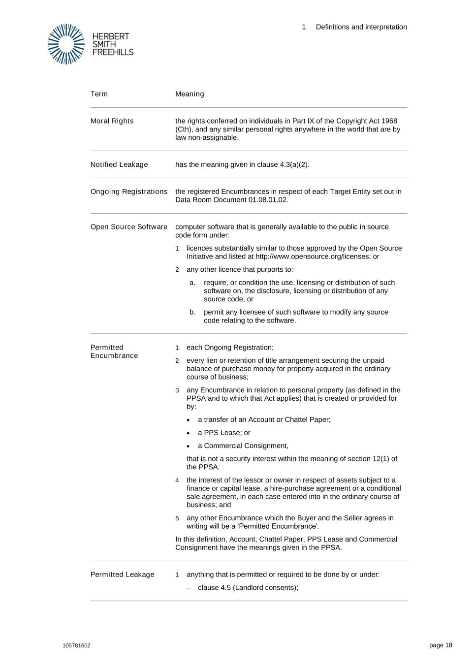 1 Definitions and interpretation 105781602 page 18 Term Meaning Moral Rights the rights conferred on individuals in Part IX of the Copyright Act 1968 (Cth), and any similar personal rights anywhere in the world that are by law non-assignable. Notified Leakage has the meaning given in clause 4.3(a)(2). Ongoing Registrations the registered Encumbrances in respect of each Target Entity set out in Data Room Document 01.08.01.02. Open Source Software computer software that is generally available to the public in source code form under: 1 licences substantially similar to those approved by the Open Source Initiative and listed at http://www.opensource.org/licenses; or 2 any other licence that purports to: a. require, or condition the use, licensing or distribution of such software on, the disclosure, licensing or distribution of any source code; or b. permit any licensee of such software to modify any source code relating to the software. Permitted Encumbrance 1 each Ongoing Registration; 2 every lien or retention of title arrangement securing the unpaid balance of purchase money for property acquired in the ordinary course of business; 3 any Encumbrance in relation to personal property (as defined in the PPSA and to which that Act applies) that is created or provided for by: • a transfer of an Account or Chattel Paper; • a PPS Lease; or • a Commercial Consignment, that is not a security interest within the meaning of section 12(1) of the PPSA; 4 the interest of the lessor or owner in respect of assets subject to a finance or capital lease, a hire-purchase agreement or a conditional sale agreement, in each case entered into in the ordinary course of business; and 5 any other Encumbrance which the Buyer and the Seller agrees in writing will be a ‘Permitted Encumbrance’. In this definition, Account, Chattel Paper, PPS Lease and Commercial Consignment have the meanings given in the PPSA. Permitted Leakage 1 anything that is permitted or required to be done by or under: – clause 4.5 (Landlord consents);
