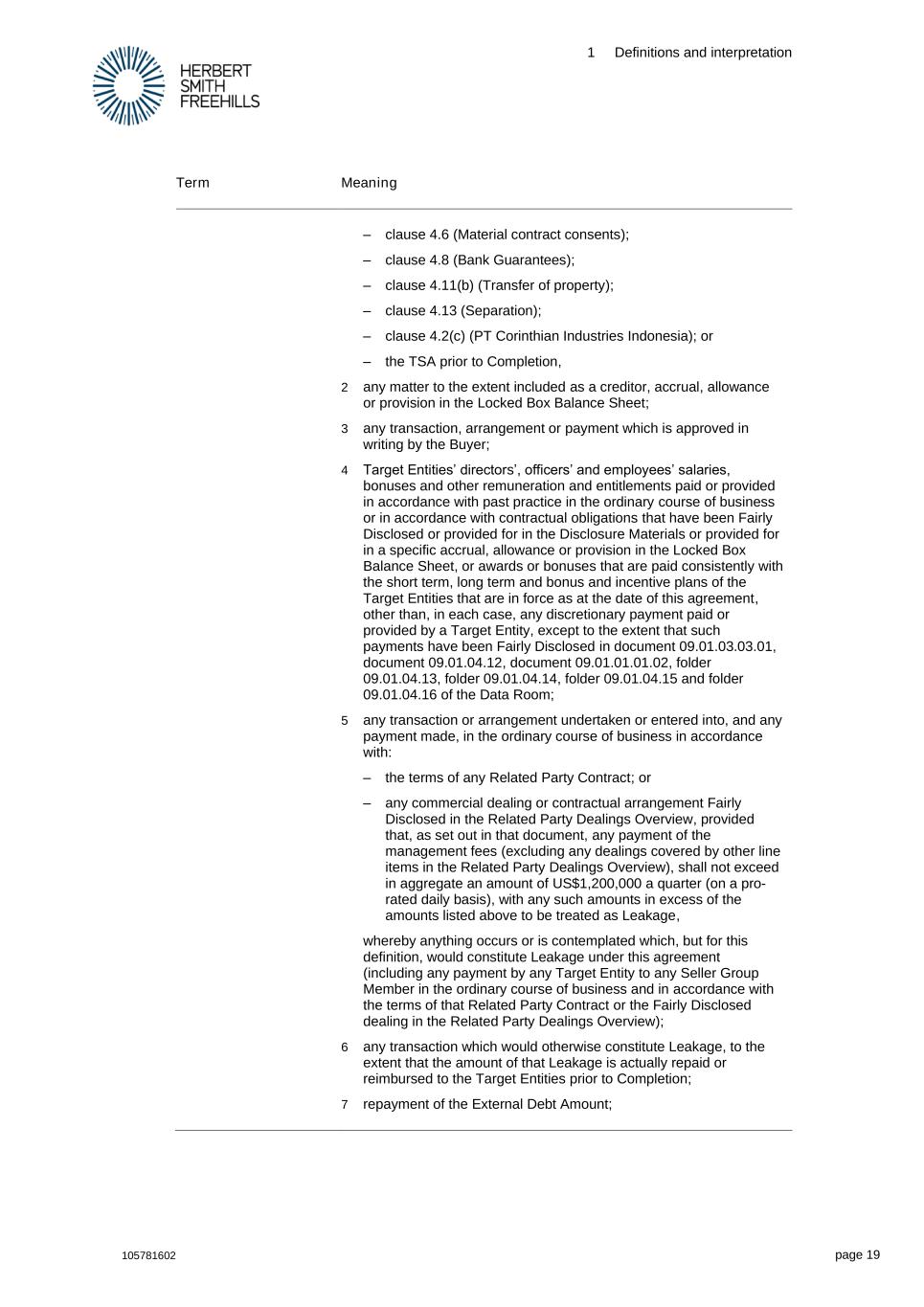 1 Definitions and interpretation 105781602 page 19 Term Meaning – clause 4.6 (Material contract consents); – clause 4.8 (Bank Guarantees); – clause 4.11(b) (Transfer of property); – clause 4.13 (Separation); – clause 4.2(c) (PT Corinthian Industries Indonesia); or – the TSA prior to Completion, 2 any matter to the extent included as a creditor, accrual, allowance or provision in the Locked Box Balance Sheet; 3 any transaction, arrangement or payment which is approved in writing by the Buyer; 4 Target Entities’ directors’, officers’ and employees’ salaries, bonuses and other remuneration and entitlements paid or provided in accordance with past practice in the ordinary course of business or in accordance with contractual obligations that have been Fairly Disclosed or provided for in the Disclosure Materials or provided for in a specific accrual, allowance or provision in the Locked Box Balance Sheet, or awards or bonuses that are paid consistently with the short term, long term and bonus and incentive plans of the Target Entities that are in force as at the date of this agreement, other than, in each case, any discretionary payment paid or provided by a Target Entity, except to the extent that such payments have been Fairly Disclosed in document 09.01.03.03.01, document 09.01.04.12, document 09.01.01.01.02, folder 09.01.04.13, folder 09.01.04.14, folder 09.01.04.15 and folder 09.01.04.16 of the Data Room; 5 any transaction or arrangement undertaken or entered into, and any payment made, in the ordinary course of business in accordance with: – the terms of any Related Party Contract; or – any commercial dealing or contractual arrangement Fairly Disclosed in the Related Party Dealings Overview, provided that, as set out in that document, any payment of the management fees (excluding any dealings covered by other line items in the Related Party Dealings Overview), shall not exceed in aggregate an amount of US$1,200,000 a quarter (on a pro- rated daily basis), with any such amounts in excess of the amounts listed above to be treated as Leakage, whereby anything occurs or is contemplated which, but for this definition, would constitute Leakage under this agreement (including any payment by any Target Entity to any Seller Group Member in the ordinary course of business and in accordance with the terms of that Related Party Contract or the Fairly Disclosed dealing in the Related Party Dealings Overview); 6 any transaction which would otherwise constitute Leakage, to the extent that the amount of that Leakage is actually repaid or reimbursed to the Target Entities prior to Completion; 7 repayment of the External Debt Amount;