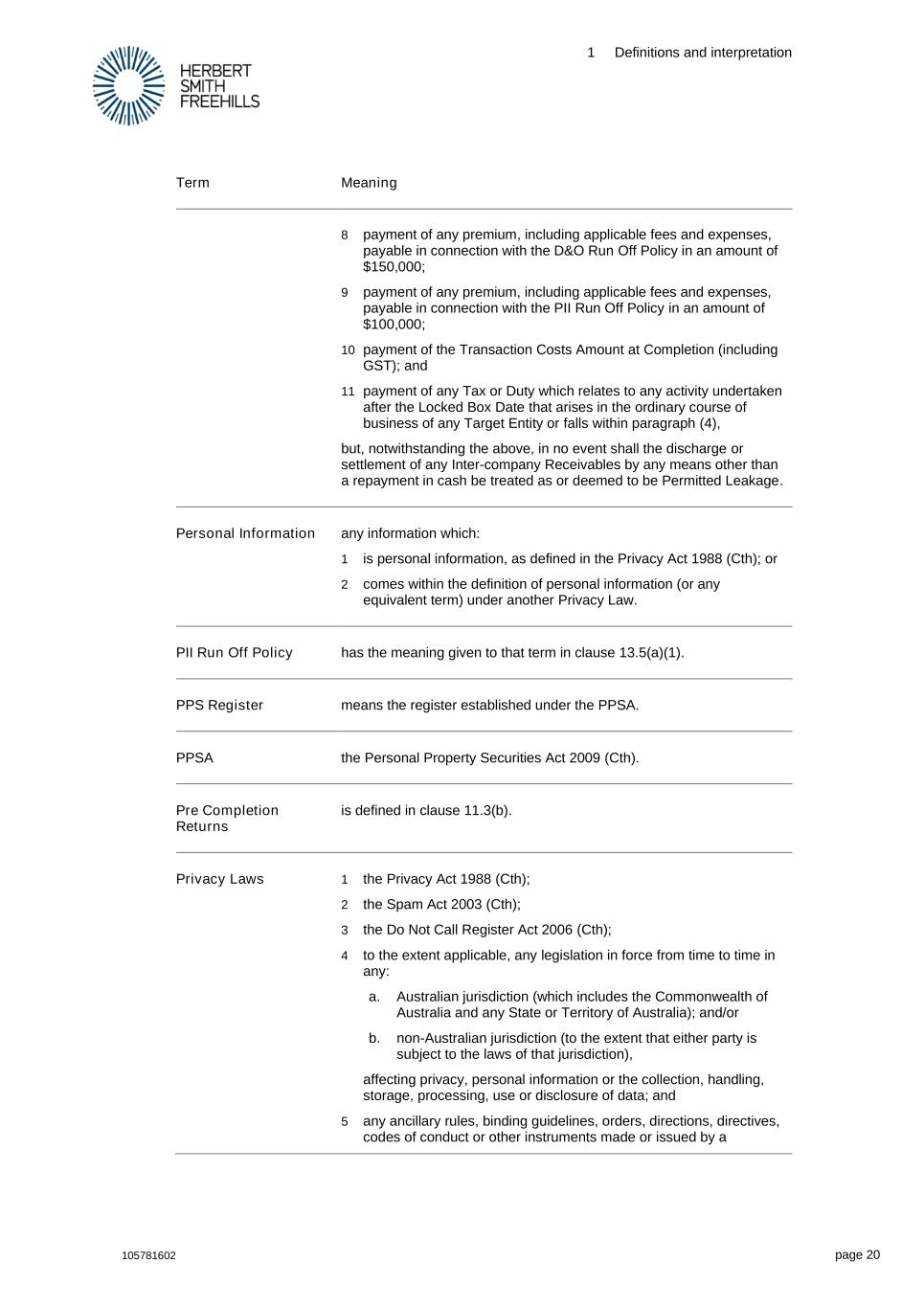 1 Definitions and interpretation 105781602 page 20 Term Meaning 8 payment of any premium, including applicable fees and expenses, payable in connection with the D&O Run Off Policy in an amount of $150,000; 9 payment of any premium, including applicable fees and expenses, payable in connection with the PII Run Off Policy in an amount of $100,000; 10 payment of the Transaction Costs Amount at Completion (including GST); and 11 payment of any Tax or Duty which relates to any activity undertaken after the Locked Box Date that arises in the ordinary course of business of any Target Entity or falls within paragraph (4), but, notwithstanding the above, in no event shall the discharge or settlement of any Inter-company Receivables by any means other than a repayment in cash be treated as or deemed to be Permitted Leakage. Personal Information any information which: 1 is personal information, as defined in the Privacy Act 1988 (Cth); or 2 comes within the definition of personal information (or any equivalent term) under another Privacy Law. PII Run Off Policy has the meaning given to that term in clause 13.5(a)(1). PPS Register means the register established under the PPSA. PPSA the Personal Property Securities Act 2009 (Cth). Pre Completion Returns is defined in clause 11.3(b). Privacy Laws 1 the Privacy Act 1988 (Cth); 2 the Spam Act 2003 (Cth); 3 the Do Not Call Register Act 2006 (Cth); 4 to the extent applicable, any legislation in force from time to time in any: a. Australian jurisdiction (which includes the Commonwealth of Australia and any State or Territory of Australia); and/or b. non-Australian jurisdiction (to the extent that either party is subject to the laws of that jurisdiction), affecting privacy, personal information or the collection, handling, storage, processing, use or disclosure of data; and 5 any ancillary rules, binding guidelines, orders, directions, directives, codes of conduct or other instruments made or issued by a
