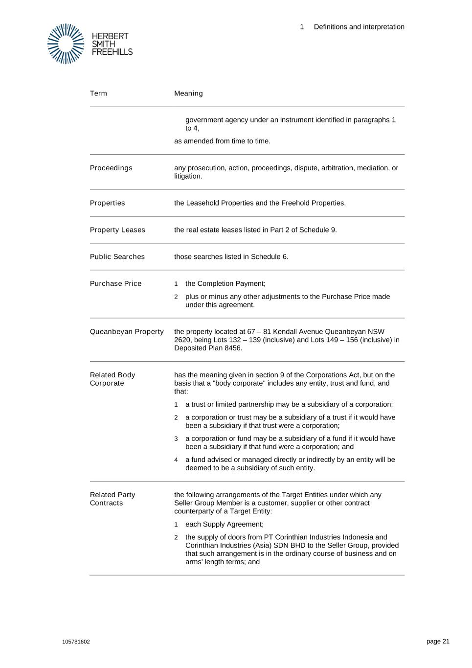 1 Definitions and interpretation 105781602 page 21 Term Meaning government agency under an instrument identified in paragraphs 1 to 4, as amended from time to time. Proceedings any prosecution, action, proceedings, dispute, arbitration, mediation, or litigation. Properties the Leasehold Properties and the Freehold Properties. Property Leases the real estate leases listed in Part 2 of Schedule 9. Public Searches those searches listed in Schedule 6. Purchase Price 1 the Completion Payment; 2 plus or minus any other adjustments to the Purchase Price made under this agreement. Queanbeyan Property the property located at 67 – 81 Kendall Avenue Queanbeyan NSW 2620, being Lots 132 – 139 (inclusive) and Lots 149 – 156 (inclusive) in Deposited Plan 8456. Related Body Corporate has the meaning given in section 9 of the Corporations Act, but on the basis that a "body corporate" includes any entity, trust and fund, and that: 1 a trust or limited partnership may be a subsidiary of a corporation; 2 a corporation or trust may be a subsidiary of a trust if it would have been a subsidiary if that trust were a corporation; 3 a corporation or fund may be a subsidiary of a fund if it would have been a subsidiary if that fund were a corporation; and 4 a fund advised or managed directly or indirectly by an entity will be deemed to be a subsidiary of such entity. Related Party Contracts the following arrangements of the Target Entities under which any Seller Group Member is a customer, supplier or other contract counterparty of a Target Entity: 1 each Supply Agreement; 2 the supply of doors from PT Corinthian Industries Indonesia and Corinthian Industries (Asia) SDN BHD to the Seller Group, provided that such arrangement is in the ordinary course of business and on arms' length terms; and