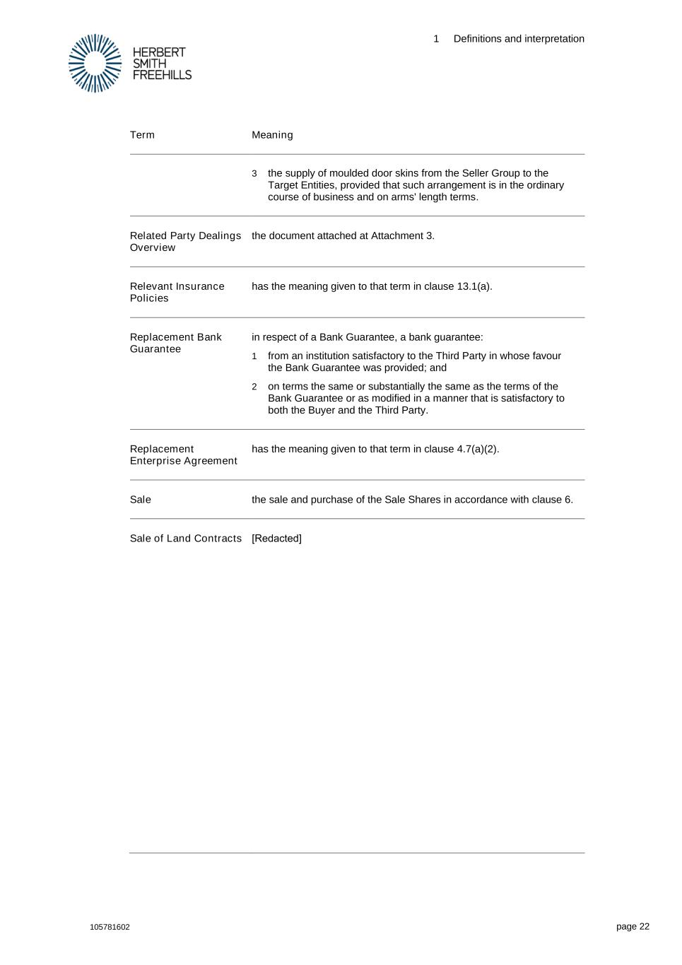 1 Definitions and interpretation 105781602 page 22 Term Meaning 3 the supply of moulded door skins from the Seller Group to the Target Entities, provided that such arrangement is in the ordinary course of business and on arms' length terms. Related Party Dealings Overview the document attached at Attachment 3. Relevant Insurance Policies has the meaning given to that term in clause 13.1(a). Replacement Bank Guarantee in respect of a Bank Guarantee, a bank guarantee: 1 from an institution satisfactory to the Third Party in whose favour the Bank Guarantee was provided; and 2 on terms the same or substantially the same as the terms of the Bank Guarantee or as modified in a manner that is satisfactory to both the Buyer and the Third Party. Replacement Enterprise Agreement has the meaning given to that term in clause 4.7(a)(2). Sale the sale and purchase of the Sale Shares in accordance with clause 6. Sale of Land Contracts [Redacted]