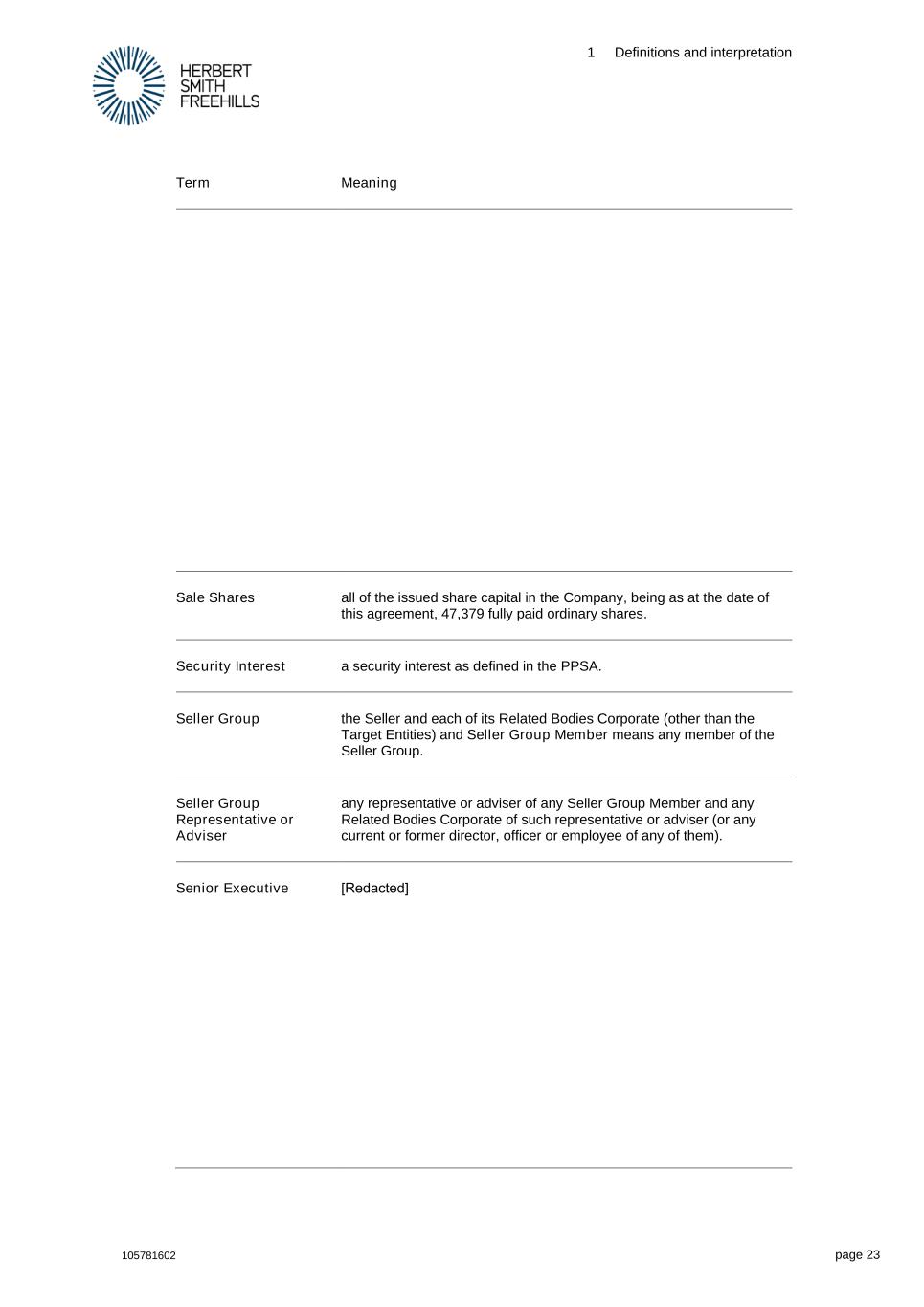 1 Definitions and interpretation 105781602 page 23 Term Meaning Sale Shares all of the issued share capital in the Company, being as at the date of this agreement, 47,379 fully paid ordinary shares. Security Interest a security interest as defined in the PPSA. Seller Group the Seller and each of its Related Bodies Corporate (other than the Target Entities) and Seller Group Member means any member of the Seller Group. Seller Group Representative or Adviser any representative or adviser of any Seller Group Member and any Related Bodies Corporate of such representative or adviser (or any current or former director, officer or employee of any of them). Senior Executive [Redacted]