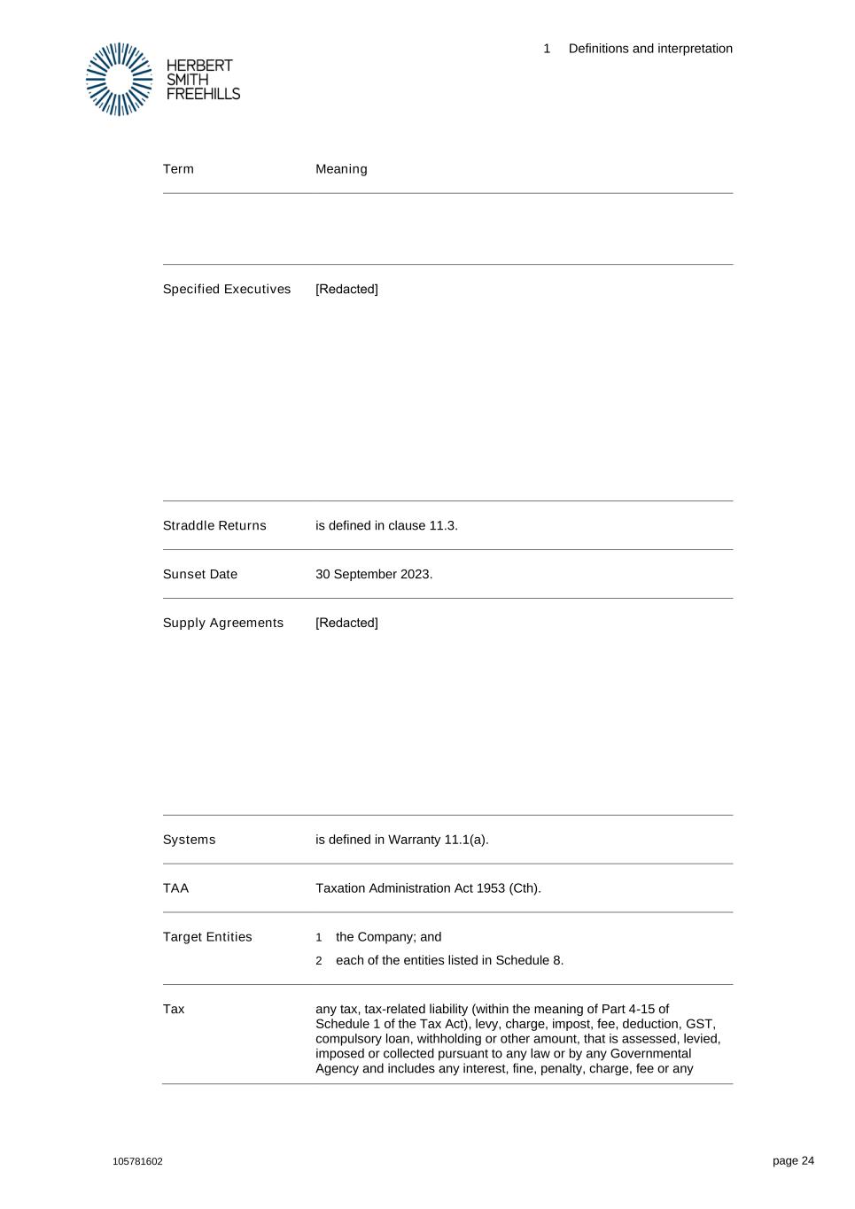 1 Definitions and interpretation 105781602 page 24 Term Meaning Specified Executives [Redacted] Straddle Returns is defined in clause 11.3. Sunset Date 30 September 2023. Supply Agreements [Redacted] Systems is defined in Warranty 11.1(a). TAA Taxation Administration Act 1953 (Cth). Target Entities 1 the Company; and 2 each of the entities listed in Schedule 8. Tax any tax, tax-related liability (within the meaning of Part 4-15 of Schedule 1 of the Tax Act), levy, charge, impost, fee, deduction, GST, compulsory loan, withholding or other amount, that is assessed, levied, imposed or collected pursuant to any law or by any Governmental Agency and includes any interest, fine, penalty, charge, fee or any