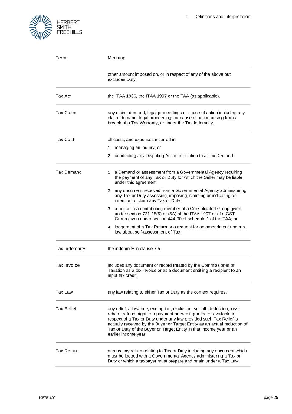 1 Definitions and interpretation 105781602 page 25 Term Meaning other amount imposed on, or in respect of any of the above but excludes Duty. Tax Act the ITAA 1936, the ITAA 1997 or the TAA (as applicable). Tax Claim any claim, demand, legal proceedings or cause of action including any claim, demand, legal proceedings or cause of action arising from a breach of a Tax Warranty, or under the Tax Indemnity. Tax Cost all costs, and expenses incurred in: 1 managing an inquiry; or 2 conducting any Disputing Action in relation to a Tax Demand. Tax Demand 1 a Demand or assessment from a Governmental Agency requiring the payment of any Tax or Duty for which the Seller may be liable under this agreement; 2 any document received from a Governmental Agency administering any Tax or Duty assessing, imposing, claiming or indicating an intention to claim any Tax or Duty; 3 a notice to a contributing member of a Consolidated Group given under section 721-15(5) or (5A) of the ITAA 1997 or of a GST Group given under section 444-90 of schedule 1 of the TAA; or 4 lodgement of a Tax Return or a request for an amendment under a law about self-assessment of Tax. Tax Indemnity the indemnity in clause 7.5. Tax Invoice includes any document or record treated by the Commissioner of Taxation as a tax invoice or as a document entitling a recipient to an input tax credit. Tax Law any law relating to either Tax or Duty as the context requires. Tax Relief any relief, allowance, exemption, exclusion, set-off, deduction, loss, rebate, refund, right to repayment or credit granted or available in respect of a Tax or Duty under any law provided such Tax Relief is actually received by the Buyer or Target Entity as an actual reduction of Tax or Duty of the Buyer or Target Entity in that income year or an earlier income year. Tax Return means any return relating to Tax or Duty including any document which must be lodged with a Governmental Agency administering a Tax or Duty or which a taxpayer must prepare and retain under a Tax Law