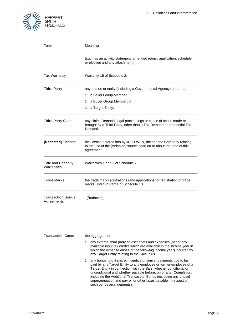 1 Definitions and interpretation 105781602 page 26 Term Meaning (such as an activity statement, amended return, application, schedule or election and any attachment). Tax Warranty Warranty 15 of Schedule 2. Third Party any person or entity (including a Governmental Agency) other than: 1 a Seller Group Member; 2 a Buyer Group Member; or 3 a Target Entity. Third Party Claim any claim, Demand, legal proceedings or cause of action made or brought by a Third Party, other than a Tax Demand or a potential Tax Demand. [Redacted] License the license entered into by JELD-WEN, Inc and the Company relating to the use of the [redacted] source code on or about the date of this agreement. Title and Capacity Warranties Warranties 1 and 2 of Schedule 2. Trade Marks the trade mark registrations (and applications for registration of trade marks) listed in Part 1 of Schedule 10. Transaction Bonus Agreements [Redacted] Transaction Costs the aggregate of: 1 any external third party adviser costs and expenses (net of any available input tax credits which are available in the income year in which the expense arises or the following income year) incurred by any Target Entity relating to the Sale; plus 2 any bonus, profit share, incentive or similar payments due to be paid by any Target Entity to any employee or former employee of a Target Entity in connection with the Sale, whether conditional or unconditional and whether payable before, on or after Completion, including the Additional Transaction Bonus (including any unpaid superannuation and payroll or other taxes payable in respect of such bonus arrangements),
