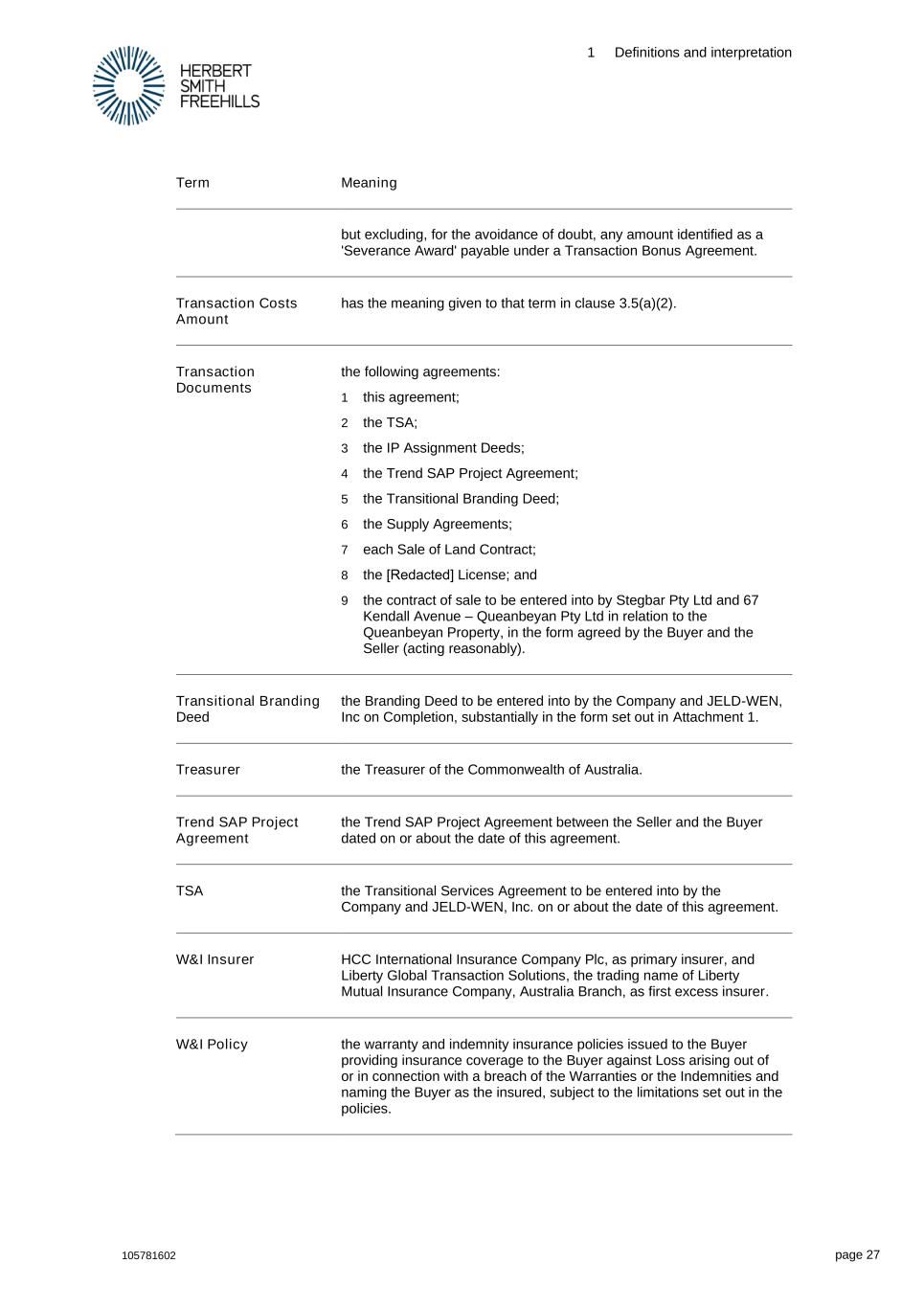 1 Definitions and interpretation 105781602 page 27 Term Meaning but excluding, for the avoidance of doubt, any amount identified as a 'Severance Award' payable under a Transaction Bonus Agreement. Transaction Costs Amount has the meaning given to that term in clause 3.5(a)(2). Transaction Documents the following agreements: 1 this agreement; 2 the TSA; 3 the IP Assignment Deeds; 4 the Trend SAP Project Agreement; 5 the Transitional Branding Deed; 6 the Supply Agreements; 7 each Sale of Land Contract; 8 the [Redacted] License; and 9 the contract of sale to be entered into by Stegbar Pty Ltd and 67 Kendall Avenue – Queanbeyan Pty Ltd in relation to the Queanbeyan Property, in the form agreed by the Buyer and the Seller (acting reasonably). Transitional Branding Deed the Branding Deed to be entered into by the Company and JELD-WEN, Inc on Completion, substantially in the form set out in Attachment 1. Treasurer the Treasurer of the Commonwealth of Australia. Trend SAP Project Agreement the Trend SAP Project Agreement between the Seller and the Buyer dated on or about the date of this agreement. TSA the Transitional Services Agreement to be entered into by the Company and JELD-WEN, Inc. on or about the date of this agreement. W&I Insurer HCC International Insurance Company Plc, as primary insurer, and Liberty Global Transaction Solutions, the trading name of Liberty Mutual Insurance Company, Australia Branch, as first excess insurer. W&I Policy the warranty and indemnity insurance policies issued to the Buyer providing insurance coverage to the Buyer against Loss arising out of or in connection with a breach of the Warranties or the Indemnities and naming the Buyer as the insured, subject to the limitations set out in the policies.
