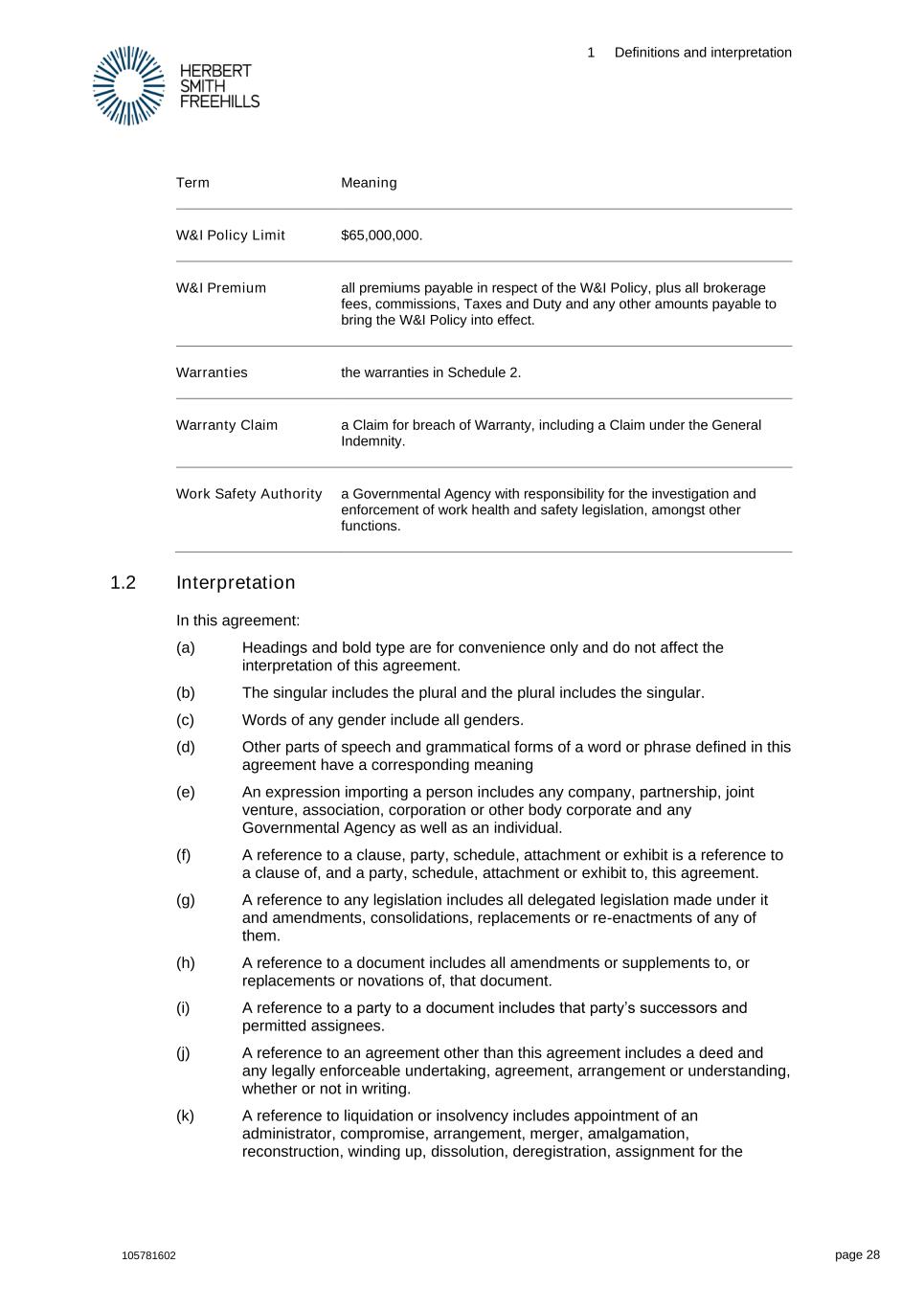 1 Definitions and interpretation 105781602 page 28 Term Meaning W&I Policy Limit $65,000,000. W&I Premium all premiums payable in respect of the W&I Policy, plus all brokerage fees, commissions, Taxes and Duty and any other amounts payable to bring the W&I Policy into effect. Warranties the warranties in Schedule 2. Warranty Claim a Claim for breach of Warranty, including a Claim under the General Indemnity. Work Safety Authority a Governmental Agency with responsibility for the investigation and enforcement of work health and safety legislation, amongst other functions. 1.2 Interpretation In this agreement: (a) Headings and bold type are for convenience only and do not affect the interpretation of this agreement. (b) The singular includes the plural and the plural includes the singular. (c) Words of any gender include all genders. (d) Other parts of speech and grammatical forms of a word or phrase defined in this agreement have a corresponding meaning (e) An expression importing a person includes any company, partnership, joint venture, association, corporation or other body corporate and any Governmental Agency as well as an individual. (f) A reference to a clause, party, schedule, attachment or exhibit is a reference to a clause of, and a party, schedule, attachment or exhibit to, this agreement. (g) A reference to any legislation includes all delegated legislation made under it and amendments, consolidations, replacements or re-enactments of any of them. (h) A reference to a document includes all amendments or supplements to, or replacements or novations of, that document. (i) A reference to a party to a document includes that party’s successors and permitted assignees. (j) A reference to an agreement other than this agreement includes a deed and any legally enforceable undertaking, agreement, arrangement or understanding, whether or not in writing. (k) A reference to liquidation or insolvency includes appointment of an administrator, compromise, arrangement, merger, amalgamation, reconstruction, winding up, dissolution, deregistration, assignment for the