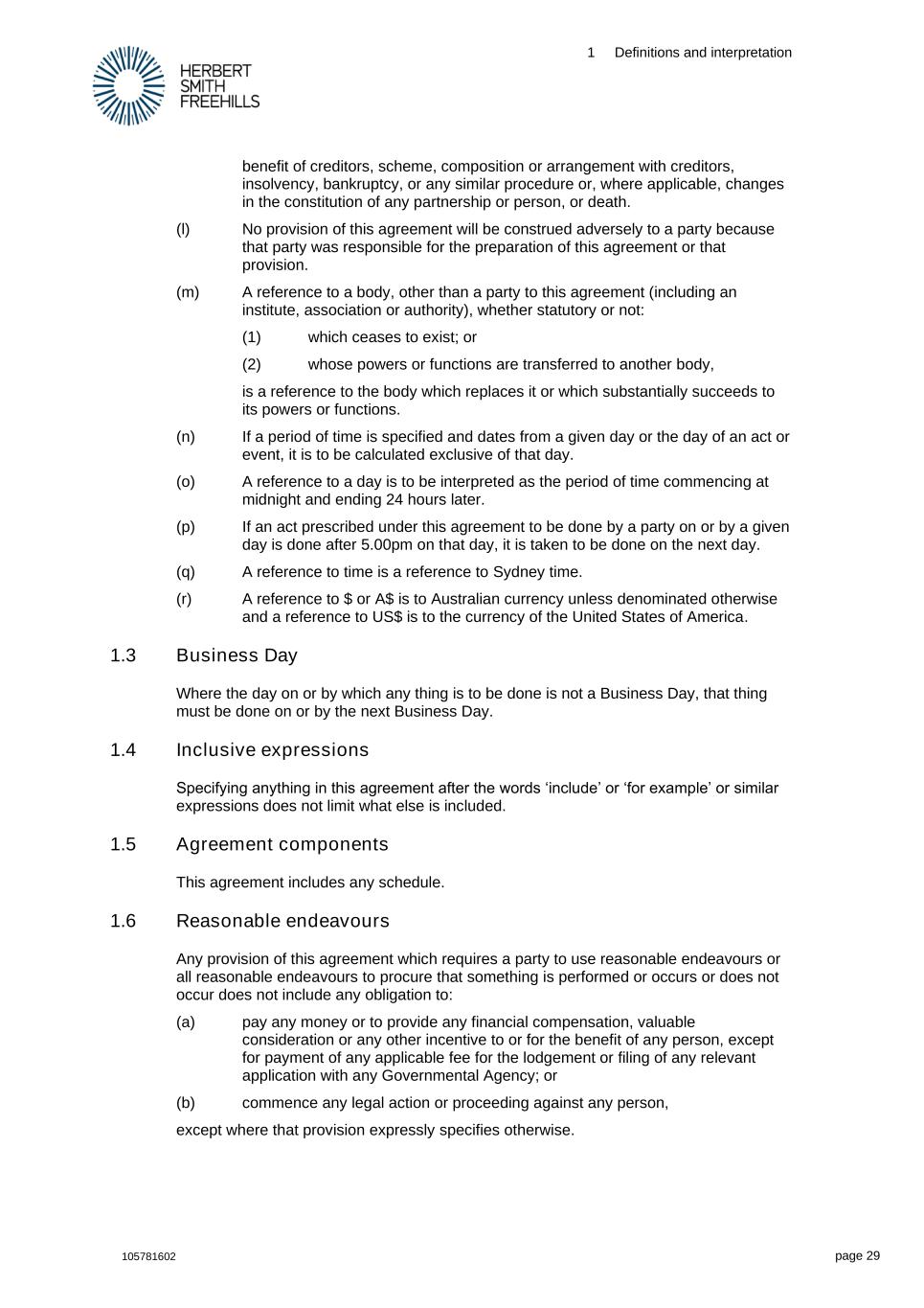 1 Definitions and interpretation 105781602 page 29 benefit of creditors, scheme, composition or arrangement with creditors, insolvency, bankruptcy, or any similar procedure or, where applicable, changes in the constitution of any partnership or person, or death. (l) No provision of this agreement will be construed adversely to a party because that party was responsible for the preparation of this agreement or that provision. (m) A reference to a body, other than a party to this agreement (including an institute, association or authority), whether statutory or not: (1) which ceases to exist; or (2) whose powers or functions are transferred to another body, is a reference to the body which replaces it or which substantially succeeds to its powers or functions. (n) If a period of time is specified and dates from a given day or the day of an act or event, it is to be calculated exclusive of that day. (o) A reference to a day is to be interpreted as the period of time commencing at midnight and ending 24 hours later. (p) If an act prescribed under this agreement to be done by a party on or by a given day is done after 5.00pm on that day, it is taken to be done on the next day. (q) A reference to time is a reference to Sydney time. (r) A reference to $ or A$ is to Australian currency unless denominated otherwise and a reference to US$ is to the currency of the United States of America. 1.3 Business Day Where the day on or by which any thing is to be done is not a Business Day, that thing must be done on or by the next Business Day. 1.4 Inclusive expressions Specifying anything in this agreement after the words ‘include’ or ‘for example’ or similar expressions does not limit what else is included. 1.5 Agreement components This agreement includes any schedule. 1.6 Reasonable endeavours Any provision of this agreement which requires a party to use reasonable endeavours or all reasonable endeavours to procure that something is performed or occurs or does not occur does not include any obligation to: (a) pay any money or to provide any financial compensation, valuable consideration or any other incentive to or for the benefit of any person, except for payment of any applicable fee for the lodgement or filing of any relevant application with any Governmental Agency; or (b) commence any legal action or proceeding against any person, except where that provision expressly specifies otherwise.