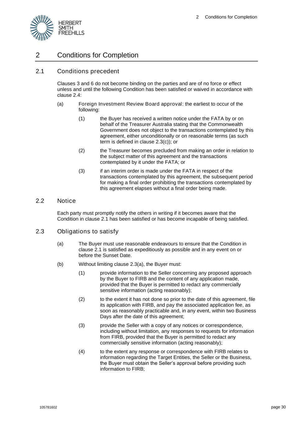 2 Conditions for Completion 105781602 page 30 2 Conditions for Completion 2.1 Conditions precedent Clauses 3 and 6 do not become binding on the parties and are of no force or effect unless and until the following Condition has been satisfied or waived in accordance with clause 2.4: (a) Foreign Investment Review Board approval: the earliest to occur of the following: (1) the Buyer has received a written notice under the FATA by or on behalf of the Treasurer Australia stating that the Commonwealth Government does not object to the transactions contemplated by this agreement, either unconditionally or on reasonable terms (as such term is defined in clause 2.3(c)); or (2) the Treasurer becomes precluded from making an order in relation to the subject matter of this agreement and the transactions contemplated by it under the FATA; or (3) if an interim order is made under the FATA in respect of the transactions contemplated by this agreement, the subsequent period for making a final order prohibiting the transactions contemplated by this agreement elapses without a final order being made. 2.2 Notice Each party must promptly notify the others in writing if it becomes aware that the Condition in clause 2.1 has been satisfied or has become incapable of being satisfied. 2.3 Obligations to satisfy (a) The Buyer must use reasonable endeavours to ensure that the Condition in clause 2.1 is satisfied as expeditiously as possible and in any event on or before the Sunset Date. (b) Without limiting clause 2.3(a), the Buyer must: (1) provide information to the Seller concerning any proposed approach by the Buyer to FIRB and the content of any application made, provided that the Buyer is permitted to redact any commercially sensitive information (acting reasonably); (2) to the extent it has not done so prior to the date of this agreement, file its application with FIRB, and pay the associated application fee, as soon as reasonably practicable and, in any event, within two Business Days after the date of this agreement; (3) provide the Seller with a copy of any notices or correspondence, including without limitation, any responses to requests for information from FIRB, provided that the Buyer is permitted to redact any commercially sensitive information (acting reasonably); (4) to the extent any response or correspondence with FIRB relates to information regarding the Target Entities, the Seller or the Business, the Buyer must obtain the Seller’s approval before providing such information to FIRB;