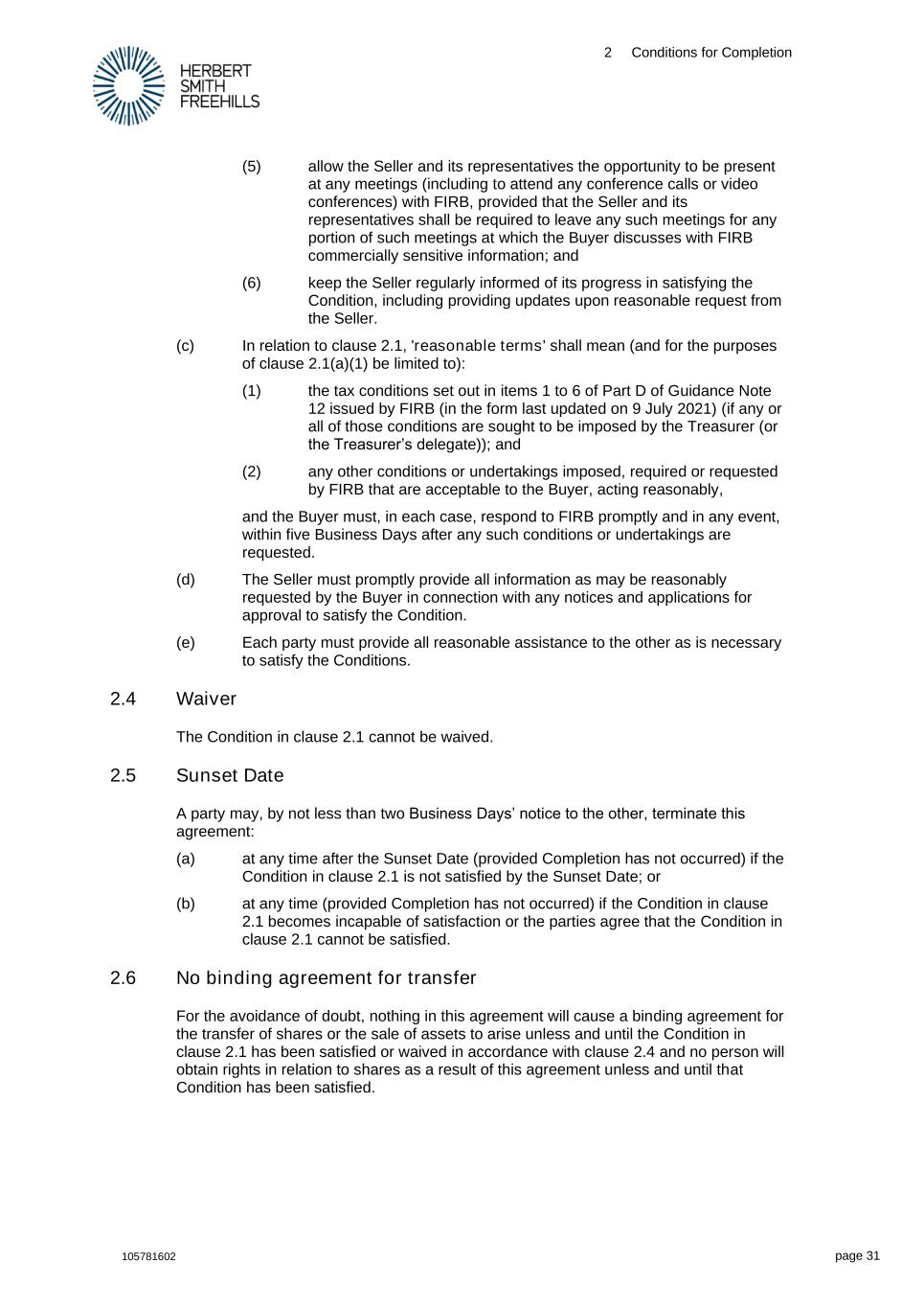 2 Conditions for Completion 105781602 page 31 (5) allow the Seller and its representatives the opportunity to be present at any meetings (including to attend any conference calls or video conferences) with FIRB, provided that the Seller and its representatives shall be required to leave any such meetings for any portion of such meetings at which the Buyer discusses with FIRB commercially sensitive information; and (6) keep the Seller regularly informed of its progress in satisfying the Condition, including providing updates upon reasonable request from the Seller. (c) In relation to clause 2.1, 'reasonable terms' shall mean (and for the purposes of clause 2.1(a)(1) be limited to): (1) the tax conditions set out in items 1 to 6 of Part D of Guidance Note 12 issued by FIRB (in the form last updated on 9 July 2021) (if any or all of those conditions are sought to be imposed by the Treasurer (or the Treasurer’s delegate)); and (2) any other conditions or undertakings imposed, required or requested by FIRB that are acceptable to the Buyer, acting reasonably, and the Buyer must, in each case, respond to FIRB promptly and in any event, within five Business Days after any such conditions or undertakings are requested. (d) The Seller must promptly provide all information as may be reasonably requested by the Buyer in connection with any notices and applications for approval to satisfy the Condition. (e) Each party must provide all reasonable assistance to the other as is necessary to satisfy the Conditions. 2.4 Waiver The Condition in clause 2.1 cannot be waived. 2.5 Sunset Date A party may, by not less than two Business Days’ notice to the other, terminate this agreement: (a) at any time after the Sunset Date (provided Completion has not occurred) if the Condition in clause 2.1 is not satisfied by the Sunset Date; or (b) at any time (provided Completion has not occurred) if the Condition in clause 2.1 becomes incapable of satisfaction or the parties agree that the Condition in clause 2.1 cannot be satisfied. 2.6 No binding agreement for transfer For the avoidance of doubt, nothing in this agreement will cause a binding agreement for the transfer of shares or the sale of assets to arise unless and until the Condition in clause 2.1 has been satisfied or waived in accordance with clause 2.4 and no person will obtain rights in relation to shares as a result of this agreement unless and until that Condition has been satisfied.