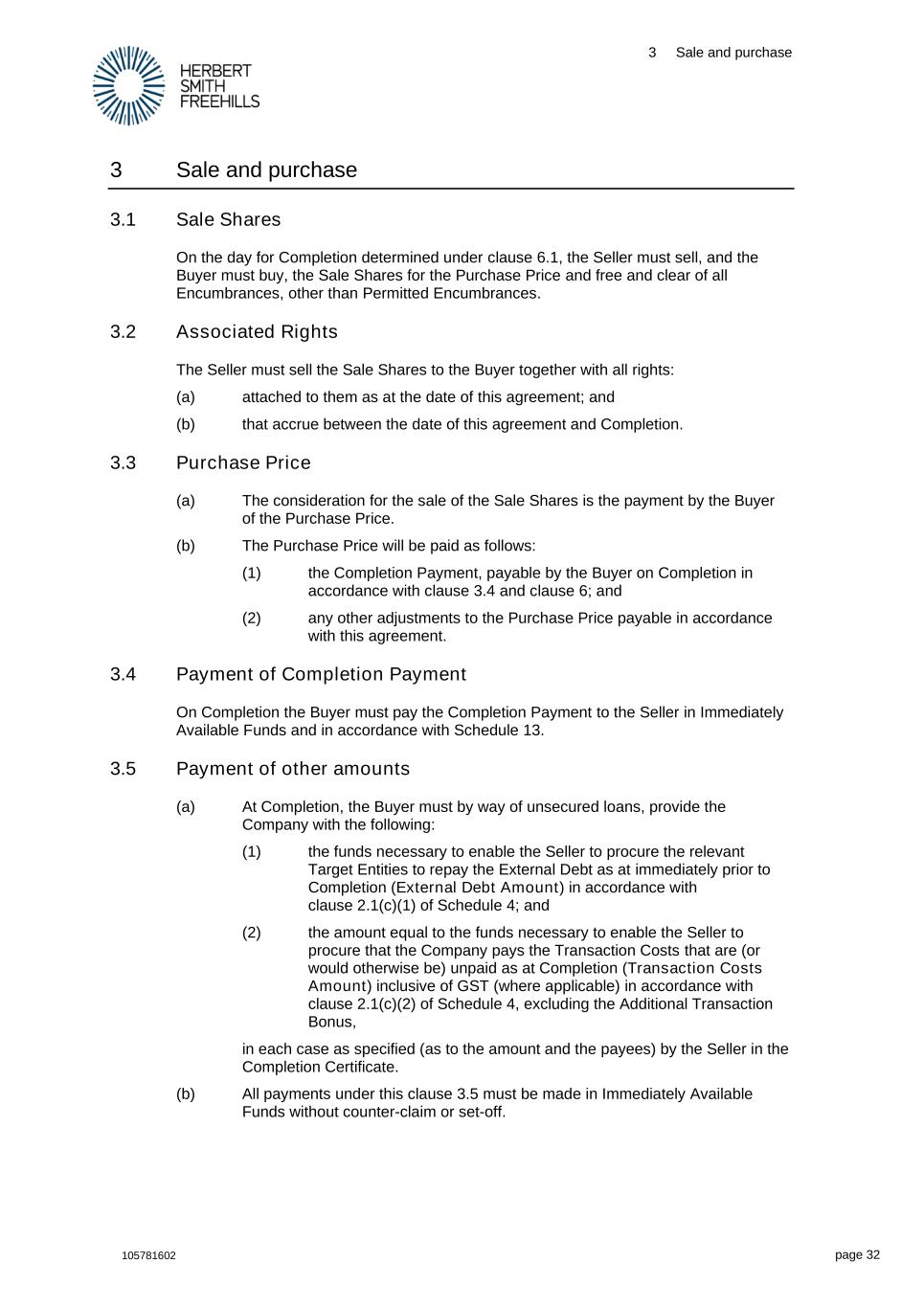 3 Sale and purchase 105781602 page 32 3 Sale and purchase 3.1 Sale Shares On the day for Completion determined under clause 6.1, the Seller must sell, and the Buyer must buy, the Sale Shares for the Purchase Price and free and clear of all Encumbrances, other than Permitted Encumbrances. 3.2 Associated Rights The Seller must sell the Sale Shares to the Buyer together with all rights: (a) attached to them as at the date of this agreement; and (b) that accrue between the date of this agreement and Completion. 3.3 Purchase Price (a) The consideration for the sale of the Sale Shares is the payment by the Buyer of the Purchase Price. (b) The Purchase Price will be paid as follows: (1) the Completion Payment, payable by the Buyer on Completion in accordance with clause 3.4 and clause 6; and (2) any other adjustments to the Purchase Price payable in accordance with this agreement. 3.4 Payment of Completion Payment On Completion the Buyer must pay the Completion Payment to the Seller in Immediately Available Funds and in accordance with Schedule 13. 3.5 Payment of other amounts (a) At Completion, the Buyer must by way of unsecured loans, provide the Company with the following: (1) the funds necessary to enable the Seller to procure the relevant Target Entities to repay the External Debt as at immediately prior to Completion (External Debt Amount) in accordance with clause 2.1(c)(1) of Schedule 4; and (2) the amount equal to the funds necessary to enable the Seller to procure that the Company pays the Transaction Costs that are (or would otherwise be) unpaid as at Completion (Transaction Costs Amount) inclusive of GST (where applicable) in accordance with clause 2.1(c)(2) of Schedule 4, excluding the Additional Transaction Bonus, in each case as specified (as to the amount and the payees) by the Seller in the Completion Certificate. (b) All payments under this clause 3.5 must be made in Immediately Available Funds without counter-claim or set-off.