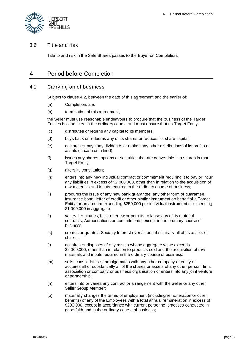 4 Period before Completion 105781602 page 33 3.6 Title and risk Title to and risk in the Sale Shares passes to the Buyer on Completion. 4 Period before Completion 4.1 Carrying on of business Subject to clause 4.2, between the date of this agreement and the earlier of: (a) Completion; and (b) termination of this agreement, the Seller must use reasonable endeavours to procure that the business of the Target Entities is conducted in the ordinary course and must ensure that no Target Entity: (c) distributes or returns any capital to its members; (d) buys back or redeems any of its shares or reduces its share capital; (e) declares or pays any dividends or makes any other distributions of its profits or assets (in cash or in kind); (f) issues any shares, options or securities that are convertible into shares in that Target Entity; (g) alters its constitution; (h) enters into any new individual contract or commitment requiring it to pay or incur any liabilities in excess of $2,000,000, other than in relation to the acquisition of raw materials and inputs required in the ordinary course of business; (i) procures the issue of any new bank guarantee, any other form of guarantee, insurance bond, letter of credit or other similar instrument on behalf of a Target Entity for an amount exceeding $250,000 per individual instrument or exceeding $1,000,000 in aggregate; (j) varies, terminates, fails to renew or permits to lapse any of its material contracts, Authorisations or commitments, except in the ordinary course of business; (k) creates or grants a Security Interest over all or substantially all of its assets or shares; (l) acquires or disposes of any assets whose aggregate value exceeds $2,000,000, other than in relation to products sold and the acquisition of raw materials and inputs required in the ordinary course of business; (m) sells, consolidates or amalgamates with any other company or entity or acquires all or substantially all of the shares or assets of any other person, firm, association or company or business organisation or enters into any joint venture or partnership; (n) enters into or varies any contract or arrangement with the Seller or any other Seller Group Member; (o) materially changes the terms of employment (including remuneration or other benefits) of any of the Employees with a total annual remuneration in excess of $200,000, except in accordance with current personnel practices conducted in good faith and in the ordinary course of business;