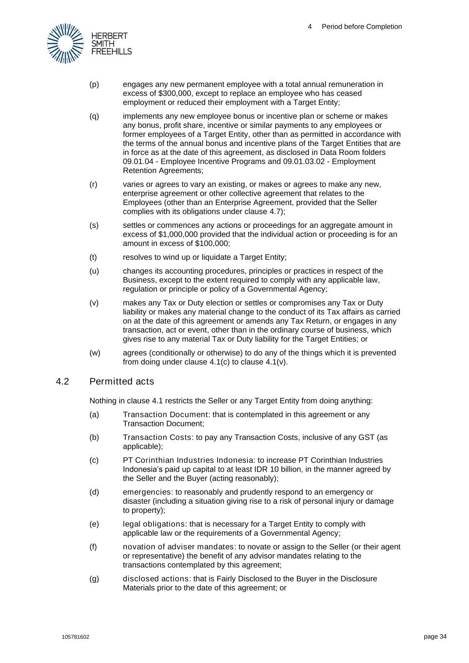 4 Period before Completion 105781602 page 34 (p) engages any new permanent employee with a total annual remuneration in excess of $300,000, except to replace an employee who has ceased employment or reduced their employment with a Target Entity; (q) implements any new employee bonus or incentive plan or scheme or makes any bonus, profit share, incentive or similar payments to any employees or former employees of a Target Entity, other than as permitted in accordance with the terms of the annual bonus and incentive plans of the Target Entities that are in force as at the date of this agreement, as disclosed in Data Room folders 09.01.04 - Employee Incentive Programs and 09.01.03.02 - Employment Retention Agreements; (r) varies or agrees to vary an existing, or makes or agrees to make any new, enterprise agreement or other collective agreement that relates to the Employees (other than an Enterprise Agreement, provided that the Seller complies with its obligations under clause 4.7); (s) settles or commences any actions or proceedings for an aggregate amount in excess of $1,000,000 provided that the individual action or proceeding is for an amount in excess of $100,000; (t) resolves to wind up or liquidate a Target Entity; (u) changes its accounting procedures, principles or practices in respect of the Business, except to the extent required to comply with any applicable law, regulation or principle or policy of a Governmental Agency; (v) makes any Tax or Duty election or settles or compromises any Tax or Duty liability or makes any material change to the conduct of its Tax affairs as carried on at the date of this agreement or amends any Tax Return, or engages in any transaction, act or event, other than in the ordinary course of business, which gives rise to any material Tax or Duty liability for the Target Entities; or (w) agrees (conditionally or otherwise) to do any of the things which it is prevented from doing under clause 4.1(c) to clause 4.1(v). 4.2 Permitted acts Nothing in clause 4.1 restricts the Seller or any Target Entity from doing anything: (a) Transaction Document: that is contemplated in this agreement or any Transaction Document; (b) Transaction Costs: to pay any Transaction Costs, inclusive of any GST (as applicable); (c) PT Corinthian Industries Indonesia: to increase PT Corinthian Industries Indonesia’s paid up capital to at least IDR 10 billion, in the manner agreed by the Seller and the Buyer (acting reasonably); (d) emergencies: to reasonably and prudently respond to an emergency or disaster (including a situation giving rise to a risk of personal injury or damage to property); (e) legal obligations: that is necessary for a Target Entity to comply with applicable law or the requirements of a Governmental Agency; (f) novation of adviser mandates: to novate or assign to the Seller (or their agent or representative) the benefit of any advisor mandates relating to the transactions contemplated by this agreement; (g) disclosed actions: that is Fairly Disclosed to the Buyer in the Disclosure Materials prior to the date of this agreement; or