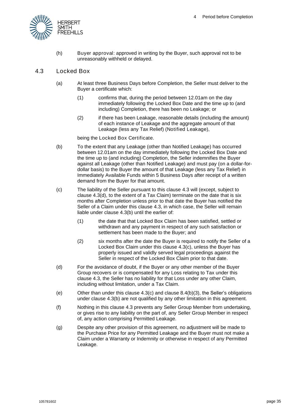 4 Period before Completion 105781602 page 35 (h) Buyer approval: approved in writing by the Buyer, such approval not to be unreasonably withheld or delayed. 4.3 Locked Box (a) At least three Business Days before Completion, the Seller must deliver to the Buyer a certificate which: (1) confirms that, during the period between 12.01am on the day immediately following the Locked Box Date and the time up to (and including) Completion, there has been no Leakage; or (2) if there has been Leakage, reasonable details (including the amount) of each instance of Leakage and the aggregate amount of that Leakage (less any Tax Relief) (Notified Leakage), being the Locked Box Certificate. (b) To the extent that any Leakage (other than Notified Leakage) has occurred between 12.01am on the day immediately following the Locked Box Date and the time up to (and including) Completion, the Seller indemnifies the Buyer against all Leakage (other than Notified Leakage) and must pay (on a dollar-for- dollar basis) to the Buyer the amount of that Leakage (less any Tax Relief) in Immediately Available Funds within 5 Business Days after receipt of a written demand from the Buyer for that amount. (c) The liability of the Seller pursuant to this clause 4.3 will (except, subject to clause 4.3(d), to the extent of a Tax Claim) terminate on the date that is six months after Completion unless prior to that date the Buyer has notified the Seller of a Claim under this clause 4.3, in which case, the Seller will remain liable under clause 4.3(b) until the earlier of: (1) the date that that Locked Box Claim has been satisfied, settled or withdrawn and any payment in respect of any such satisfaction or settlement has been made to the Buyer; and (2) six months after the date the Buyer is required to notify the Seller of a Locked Box Claim under this clause 4.3(c), unless the Buyer has properly issued and validly served legal proceedings against the Seller in respect of the Locked Box Claim prior to that date. (d) For the avoidance of doubt, if the Buyer or any other member of the Buyer Group recovers or is compensated for any Loss relating to Tax under this clause 4.3, the Seller has no liability for that Loss under any other Claim, including without limitation, under a Tax Claim. (e) Other than under this clause 4.3(c) and clause 8.4(b)(3), the Seller’s obligations under clause 4.3(b) are not qualified by any other limitation in this agreement. (f) Nothing in this clause 4.3 prevents any Seller Group Member from undertaking, or gives rise to any liability on the part of, any Seller Group Member in respect of, any action comprising Permitted Leakage. (g) Despite any other provision of this agreement, no adjustment will be made to the Purchase Price for any Permitted Leakage and the Buyer must not make a Claim under a Warranty or Indemnity or otherwise in respect of any Permitted Leakage.