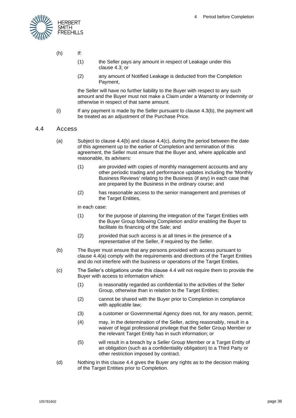 4 Period before Completion 105781602 page 36 (h) If: (1) the Seller pays any amount in respect of Leakage under this clause 4.3; or (2) any amount of Notified Leakage is deducted from the Completion Payment, the Seller will have no further liability to the Buyer with respect to any such amount and the Buyer must not make a Claim under a Warranty or Indemnity or otherwise in respect of that same amount. (i) If any payment is made by the Seller pursuant to clause 4.3(b), the payment will be treated as an adjustment of the Purchase Price. 4.4 Access (a) Subject to clause 4.4(b) and clause 4.4(c), during the period between the date of this agreement up to the earlier of Completion and termination of this agreement, the Seller must ensure that the Buyer and, where applicable and reasonable, its advisers: (1) are provided with copies of monthly management accounts and any other periodic trading and performance updates including the 'Monthly Business Reviews' relating to the Business (if any) in each case that are prepared by the Business in the ordinary course; and (2) has reasonable access to the senior management and premises of the Target Entities, in each case: (1) for the purpose of planning the integration of the Target Entities with the Buyer Group following Completion and/or enabling the Buyer to facilitate its financing of the Sale; and (2) provided that such access is at all times in the presence of a representative of the Seller, if required by the Seller. (b) The Buyer must ensure that any persons provided with access pursuant to clause 4.4(a) comply with the requirements and directions of the Target Entities and do not interfere with the business or operations of the Target Entities. (c) The Seller’s obligations under this clause 4.4 will not require them to provide the Buyer with access to information which: (1) is reasonably regarded as confidential to the activities of the Seller Group, otherwise than in relation to the Target Entities; (2) cannot be shared with the Buyer prior to Completion in compliance with applicable law; (3) a customer or Governmental Agency does not, for any reason, permit; (4) may, in the determination of the Seller, acting reasonably, result in a waiver of legal professional privilege that the Seller Group Member or the relevant Target Entity has in such information; or (5) will result in a breach by a Seller Group Member or a Target Entity of an obligation (such as a confidentiality obligation) to a Third Party or other restriction imposed by contract. (d) Nothing in this clause 4.4 gives the Buyer any rights as to the decision making of the Target Entities prior to Completion.