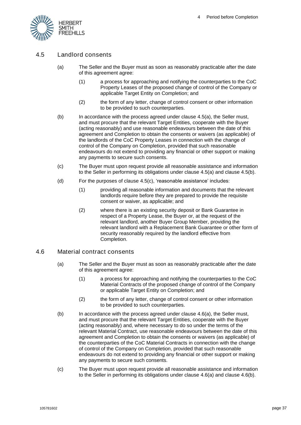 4 Period before Completion 105781602 page 37 4.5 Landlord consents (a) The Seller and the Buyer must as soon as reasonably practicable after the date of this agreement agree: (1) a process for approaching and notifying the counterparties to the CoC Property Leases of the proposed change of control of the Company or applicable Target Entity on Completion; and (2) the form of any letter, change of control consent or other information to be provided to such counterparties. (b) In accordance with the process agreed under clause 4.5(a), the Seller must, and must procure that the relevant Target Entities, cooperate with the Buyer (acting reasonably) and use reasonable endeavours between the date of this agreement and Completion to obtain the consents or waivers (as applicable) of the landlords of the CoC Property Leases in connection with the change of control of the Company on Completion, provided that such reasonable endeavours do not extend to providing any financial or other support or making any payments to secure such consents. (c) The Buyer must upon request provide all reasonable assistance and information to the Seller in performing its obligations under clause 4.5(a) and clause 4.5(b). (d) For the purposes of clause 4.5(c), ‘reasonable assistance’ includes: (1) providing all reasonable information and documents that the relevant landlords require before they are prepared to provide the requisite consent or waiver, as applicable; and (2) where there is an existing security deposit or Bank Guarantee in respect of a Property Lease, the Buyer or, at the request of the relevant landlord, another Buyer Group Member, providing the relevant landlord with a Replacement Bank Guarantee or other form of security reasonably required by the landlord effective from Completion. 4.6 Material contract consents (a) The Seller and the Buyer must as soon as reasonably practicable after the date of this agreement agree: (1) a process for approaching and notifying the counterparties to the CoC Material Contracts of the proposed change of control of the Company or applicable Target Entity on Completion; and (2) the form of any letter, change of control consent or other information to be provided to such counterparties. (b) In accordance with the process agreed under clause 4.6(a), the Seller must, and must procure that the relevant Target Entities, cooperate with the Buyer (acting reasonably) and, where necessary to do so under the terms of the relevant Material Contract, use reasonable endeavours between the date of this agreement and Completion to obtain the consents or waivers (as applicable) of the counterparties of the CoC Material Contracts in connection with the change of control of the Company on Completion, provided that such reasonable endeavours do not extend to providing any financial or other support or making any payments to secure such consents. (c) The Buyer must upon request provide all reasonable assistance and information to the Seller in performing its obligations under clause 4.6(a) and clause 4.6(b).