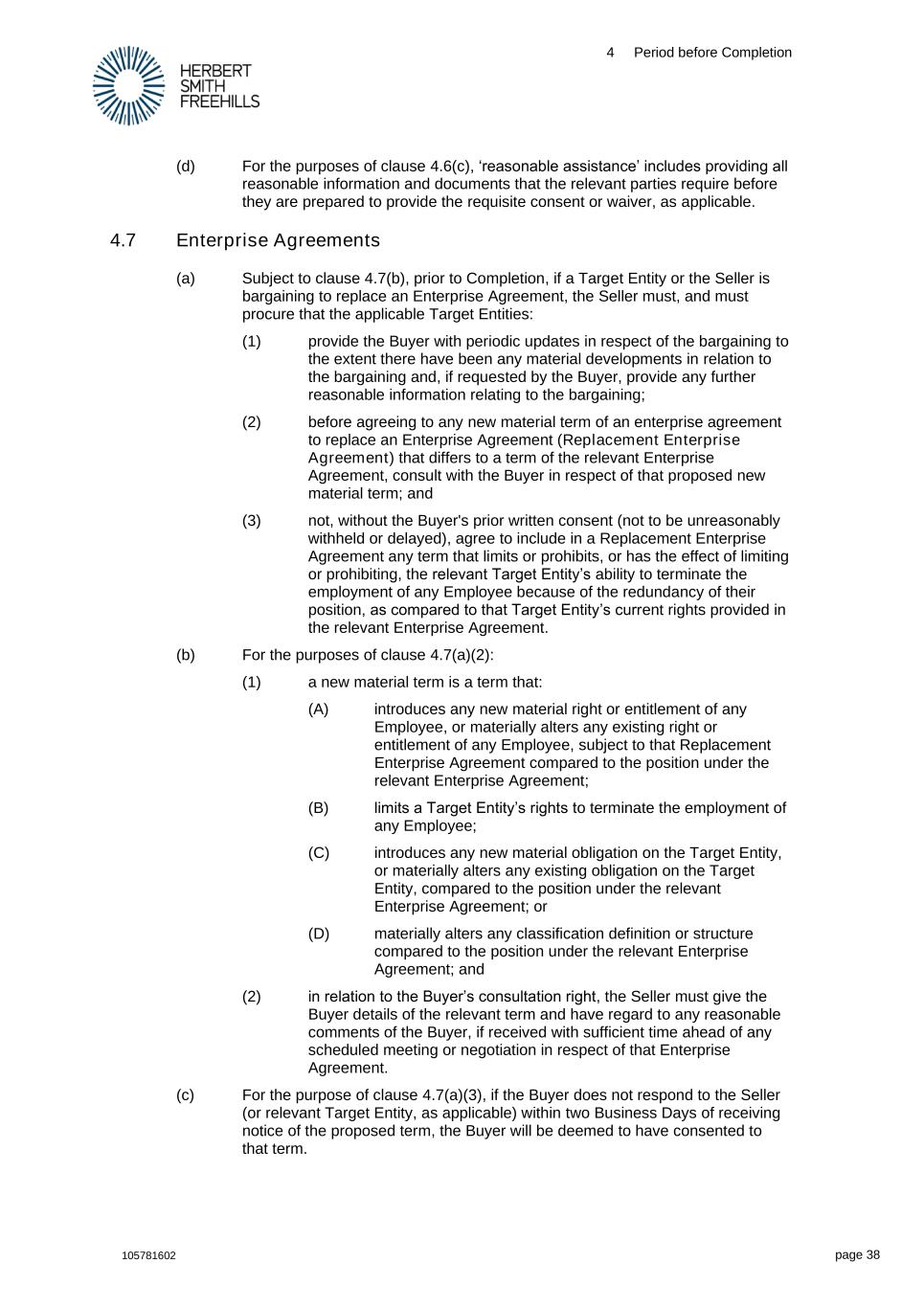 4 Period before Completion 105781602 page 38 (d) For the purposes of clause 4.6(c), ‘reasonable assistance’ includes providing all reasonable information and documents that the relevant parties require before they are prepared to provide the requisite consent or waiver, as applicable. 4.7 Enterprise Agreements (a) Subject to clause 4.7(b), prior to Completion, if a Target Entity or the Seller is bargaining to replace an Enterprise Agreement, the Seller must, and must procure that the applicable Target Entities: (1) provide the Buyer with periodic updates in respect of the bargaining to the extent there have been any material developments in relation to the bargaining and, if requested by the Buyer, provide any further reasonable information relating to the bargaining; (2) before agreeing to any new material term of an enterprise agreement to replace an Enterprise Agreement (Replacement Enterprise Agreement) that differs to a term of the relevant Enterprise Agreement, consult with the Buyer in respect of that proposed new material term; and (3) not, without the Buyer's prior written consent (not to be unreasonably withheld or delayed), agree to include in a Replacement Enterprise Agreement any term that limits or prohibits, or has the effect of limiting or prohibiting, the relevant Target Entity’s ability to terminate the employment of any Employee because of the redundancy of their position, as compared to that Target Entity’s current rights provided in the relevant Enterprise Agreement. (b) For the purposes of clause 4.7(a)(2): (1) a new material term is a term that: (A) introduces any new material right or entitlement of any Employee, or materially alters any existing right or entitlement of any Employee, subject to that Replacement Enterprise Agreement compared to the position under the relevant Enterprise Agreement; (B) limits a Target Entity’s rights to terminate the employment of any Employee; (C) introduces any new material obligation on the Target Entity, or materially alters any existing obligation on the Target Entity, compared to the position under the relevant Enterprise Agreement; or (D) materially alters any classification definition or structure compared to the position under the relevant Enterprise Agreement; and (2) in relation to the Buyer’s consultation right, the Seller must give the Buyer details of the relevant term and have regard to any reasonable comments of the Buyer, if received with sufficient time ahead of any scheduled meeting or negotiation in respect of that Enterprise Agreement. (c) For the purpose of clause 4.7(a)(3), if the Buyer does not respond to the Seller (or relevant Target Entity, as applicable) within two Business Days of receiving notice of the proposed term, the Buyer will be deemed to have consented to that term.