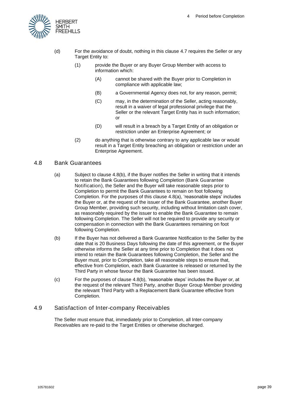 4 Period before Completion 105781602 page 39 (d) For the avoidance of doubt, nothing in this clause 4.7 requires the Seller or any Target Entity to: (1) provide the Buyer or any Buyer Group Member with access to information which: (A) cannot be shared with the Buyer prior to Completion in compliance with applicable law; (B) a Governmental Agency does not, for any reason, permit; (C) may, in the determination of the Seller, acting reasonably, result in a waiver of legal professional privilege that the Seller or the relevant Target Entity has in such information; or (D) will result in a breach by a Target Entity of an obligation or restriction under an Enterprise Agreement; or (2) do anything that is otherwise contrary to any applicable law or would result in a Target Entity breaching an obligation or restriction under an Enterprise Agreement. 4.8 Bank Guarantees (a) Subject to clause 4.8(b), if the Buyer notifies the Seller in writing that it intends to retain the Bank Guarantees following Completion (Bank Guarantee Notification), the Seller and the Buyer will take reasonable steps prior to Completion to permit the Bank Guarantees to remain on foot following Completion. For the purposes of this clause 4.8(a), ‘reasonable steps’ includes the Buyer or, at the request of the issuer of the Bank Guarantee, another Buyer Group Member, providing such security, including without limitation cash cover, as reasonably required by the issuer to enable the Bank Guarantee to remain following Completion. The Seller will not be required to provide any security or compensation in connection with the Bank Guarantees remaining on foot following Completion. (b) If the Buyer has not delivered a Bank Guarantee Notification to the Seller by the date that is 20 Business Days following the date of this agreement, or the Buyer otherwise informs the Seller at any time prior to Completion that it does not intend to retain the Bank Guarantees following Completion, the Seller and the Buyer must, prior to Completion, take all reasonable steps to ensure that, effective from Completion, each Bank Guarantee is released or returned by the Third Party in whose favour the Bank Guarantee has been issued. (c) For the purposes of clause 4.8(b), ‘reasonable steps’ includes the Buyer or, at the request of the relevant Third Party, another Buyer Group Member providing the relevant Third Party with a Replacement Bank Guarantee effective from Completion. 4.9 Satisfaction of Inter-company Receivables The Seller must ensure that, immediately prior to Completion, all Inter-company Receivables are re-paid to the Target Entities or otherwise discharged.