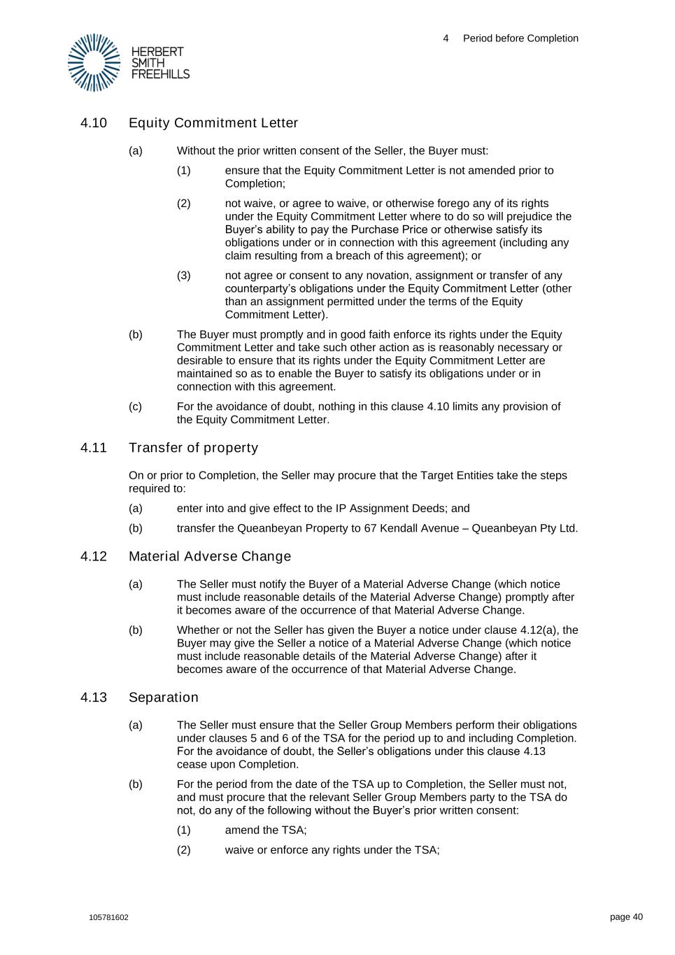 4 Period before Completion 105781602 page 40 4.10 Equity Commitment Letter (a) Without the prior written consent of the Seller, the Buyer must: (1) ensure that the Equity Commitment Letter is not amended prior to Completion; (2) not waive, or agree to waive, or otherwise forego any of its rights under the Equity Commitment Letter where to do so will prejudice the Buyer’s ability to pay the Purchase Price or otherwise satisfy its obligations under or in connection with this agreement (including any claim resulting from a breach of this agreement); or (3) not agree or consent to any novation, assignment or transfer of any counterparty’s obligations under the Equity Commitment Letter (other than an assignment permitted under the terms of the Equity Commitment Letter). (b) The Buyer must promptly and in good faith enforce its rights under the Equity Commitment Letter and take such other action as is reasonably necessary or desirable to ensure that its rights under the Equity Commitment Letter are maintained so as to enable the Buyer to satisfy its obligations under or in connection with this agreement. (c) For the avoidance of doubt, nothing in this clause 4.10 limits any provision of the Equity Commitment Letter. 4.11 Transfer of property On or prior to Completion, the Seller may procure that the Target Entities take the steps required to: (a) enter into and give effect to the IP Assignment Deeds; and (b) transfer the Queanbeyan Property to 67 Kendall Avenue – Queanbeyan Pty Ltd. 4.12 Material Adverse Change (a) The Seller must notify the Buyer of a Material Adverse Change (which notice must include reasonable details of the Material Adverse Change) promptly after it becomes aware of the occurrence of that Material Adverse Change. (b) Whether or not the Seller has given the Buyer a notice under clause 4.12(a), the Buyer may give the Seller a notice of a Material Adverse Change (which notice must include reasonable details of the Material Adverse Change) after it becomes aware of the occurrence of that Material Adverse Change. 4.13 Separation (a) The Seller must ensure that the Seller Group Members perform their obligations under clauses 5 and 6 of the TSA for the period up to and including Completion. For the avoidance of doubt, the Seller’s obligations under this clause 4.13 cease upon Completion. (b) For the period from the date of the TSA up to Completion, the Seller must not, and must procure that the relevant Seller Group Members party to the TSA do not, do any of the following without the Buyer’s prior written consent: (1) amend the TSA; (2) waive or enforce any rights under the TSA;