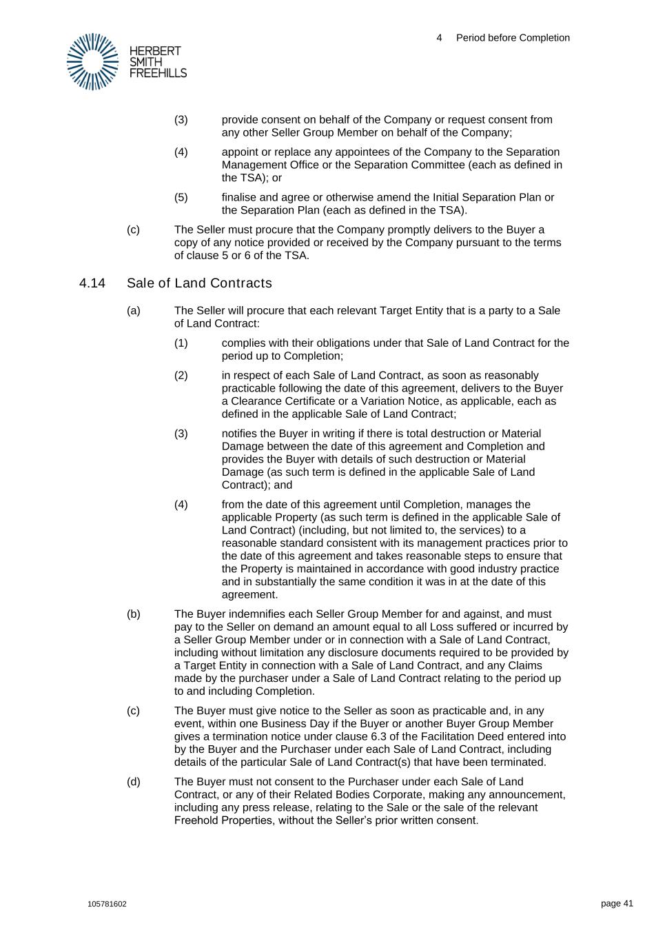 4 Period before Completion 105781602 page 41 (3) provide consent on behalf of the Company or request consent from any other Seller Group Member on behalf of the Company; (4) appoint or replace any appointees of the Company to the Separation Management Office or the Separation Committee (each as defined in the TSA); or (5) finalise and agree or otherwise amend the Initial Separation Plan or the Separation Plan (each as defined in the TSA). (c) The Seller must procure that the Company promptly delivers to the Buyer a copy of any notice provided or received by the Company pursuant to the terms of clause 5 or 6 of the TSA. 4.14 Sale of Land Contracts (a) The Seller will procure that each relevant Target Entity that is a party to a Sale of Land Contract: (1) complies with their obligations under that Sale of Land Contract for the period up to Completion; (2) in respect of each Sale of Land Contract, as soon as reasonably practicable following the date of this agreement, delivers to the Buyer a Clearance Certificate or a Variation Notice, as applicable, each as defined in the applicable Sale of Land Contract; (3) notifies the Buyer in writing if there is total destruction or Material Damage between the date of this agreement and Completion and provides the Buyer with details of such destruction or Material Damage (as such term is defined in the applicable Sale of Land Contract); and (4) from the date of this agreement until Completion, manages the applicable Property (as such term is defined in the applicable Sale of Land Contract) (including, but not limited to, the services) to a reasonable standard consistent with its management practices prior to the date of this agreement and takes reasonable steps to ensure that the Property is maintained in accordance with good industry practice and in substantially the same condition it was in at the date of this agreement. (b) The Buyer indemnifies each Seller Group Member for and against, and must pay to the Seller on demand an amount equal to all Loss suffered or incurred by a Seller Group Member under or in connection with a Sale of Land Contract, including without limitation any disclosure documents required to be provided by a Target Entity in connection with a Sale of Land Contract, and any Claims made by the purchaser under a Sale of Land Contract relating to the period up to and including Completion. (c) The Buyer must give notice to the Seller as soon as practicable and, in any event, within one Business Day if the Buyer or another Buyer Group Member gives a termination notice under clause 6.3 of the Facilitation Deed entered into by the Buyer and the Purchaser under each Sale of Land Contract, including details of the particular Sale of Land Contract(s) that have been terminated. (d) The Buyer must not consent to the Purchaser under each Sale of Land Contract, or any of their Related Bodies Corporate, making any announcement, including any press release, relating to the Sale or the sale of the relevant Freehold Properties, without the Seller’s prior written consent.