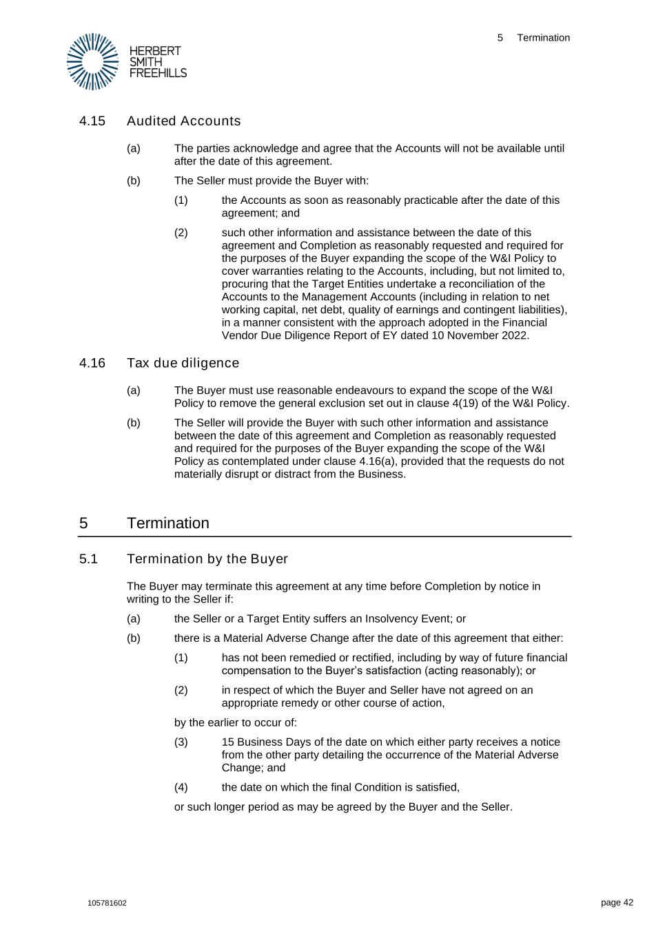 5 Termination 105781602 page 42 4.15 Audited Accounts (a) The parties acknowledge and agree that the Accounts will not be available until after the date of this agreement. (b) The Seller must provide the Buyer with: (1) the Accounts as soon as reasonably practicable after the date of this agreement; and (2) such other information and assistance between the date of this agreement and Completion as reasonably requested and required for the purposes of the Buyer expanding the scope of the W&I Policy to cover warranties relating to the Accounts, including, but not limited to, procuring that the Target Entities undertake a reconciliation of the Accounts to the Management Accounts (including in relation to net working capital, net debt, quality of earnings and contingent liabilities), in a manner consistent with the approach adopted in the Financial Vendor Due Diligence Report of EY dated 10 November 2022. 4.16 Tax due diligence (a) The Buyer must use reasonable endeavours to expand the scope of the W&I Policy to remove the general exclusion set out in clause 4(19) of the W&I Policy. (b) The Seller will provide the Buyer with such other information and assistance between the date of this agreement and Completion as reasonably requested and required for the purposes of the Buyer expanding the scope of the W&I Policy as contemplated under clause 4.16(a), provided that the requests do not materially disrupt or distract from the Business. 5 Termination 5.1 Termination by the Buyer The Buyer may terminate this agreement at any time before Completion by notice in writing to the Seller if: (a) the Seller or a Target Entity suffers an Insolvency Event; or (b) there is a Material Adverse Change after the date of this agreement that either: (1) has not been remedied or rectified, including by way of future financial compensation to the Buyer’s satisfaction (acting reasonably); or (2) in respect of which the Buyer and Seller have not agreed on an appropriate remedy or other course of action, by the earlier to occur of: (3) 15 Business Days of the date on which either party receives a notice from the other party detailing the occurrence of the Material Adverse Change; and (4) the date on which the final Condition is satisfied, or such longer period as may be agreed by the Buyer and the Seller.