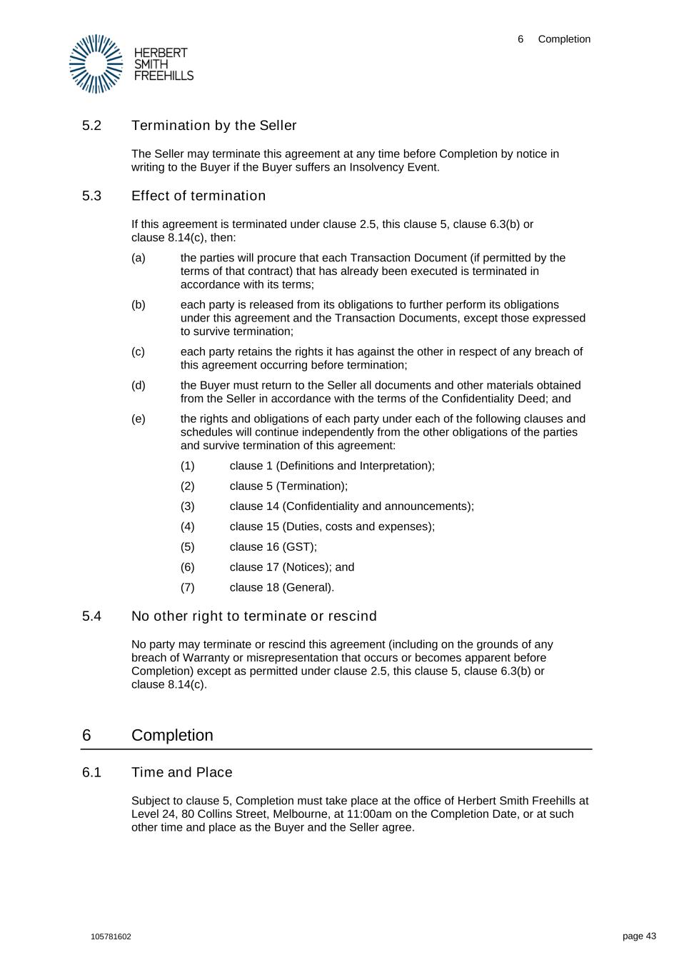 6 Completion 105781602 page 43 5.2 Termination by the Seller The Seller may terminate this agreement at any time before Completion by notice in writing to the Buyer if the Buyer suffers an Insolvency Event. 5.3 Effect of termination If this agreement is terminated under clause 2.5, this clause 5, clause 6.3(b) or clause 8.14(c), then: (a) the parties will procure that each Transaction Document (if permitted by the terms of that contract) that has already been executed is terminated in accordance with its terms; (b) each party is released from its obligations to further perform its obligations under this agreement and the Transaction Documents, except those expressed to survive termination; (c) each party retains the rights it has against the other in respect of any breach of this agreement occurring before termination; (d) the Buyer must return to the Seller all documents and other materials obtained from the Seller in accordance with the terms of the Confidentiality Deed; and (e) the rights and obligations of each party under each of the following clauses and schedules will continue independently from the other obligations of the parties and survive termination of this agreement: (1) clause 1 (Definitions and Interpretation); (2) clause 5 (Termination); (3) clause 14 (Confidentiality and announcements); (4) clause 15 (Duties, costs and expenses); (5) clause 16 (GST); (6) clause 17 (Notices); and (7) clause 18 (General). 5.4 No other right to terminate or rescind No party may terminate or rescind this agreement (including on the grounds of any breach of Warranty or misrepresentation that occurs or becomes apparent before Completion) except as permitted under clause 2.5, this clause 5, clause 6.3(b) or clause 8.14(c). 6 Completion 6.1 Time and Place Subject to clause 5, Completion must take place at the office of Herbert Smith Freehills at Level 24, 80 Collins Street, Melbourne, at 11:00am on the Completion Date, or at such other time and place as the Buyer and the Seller agree.