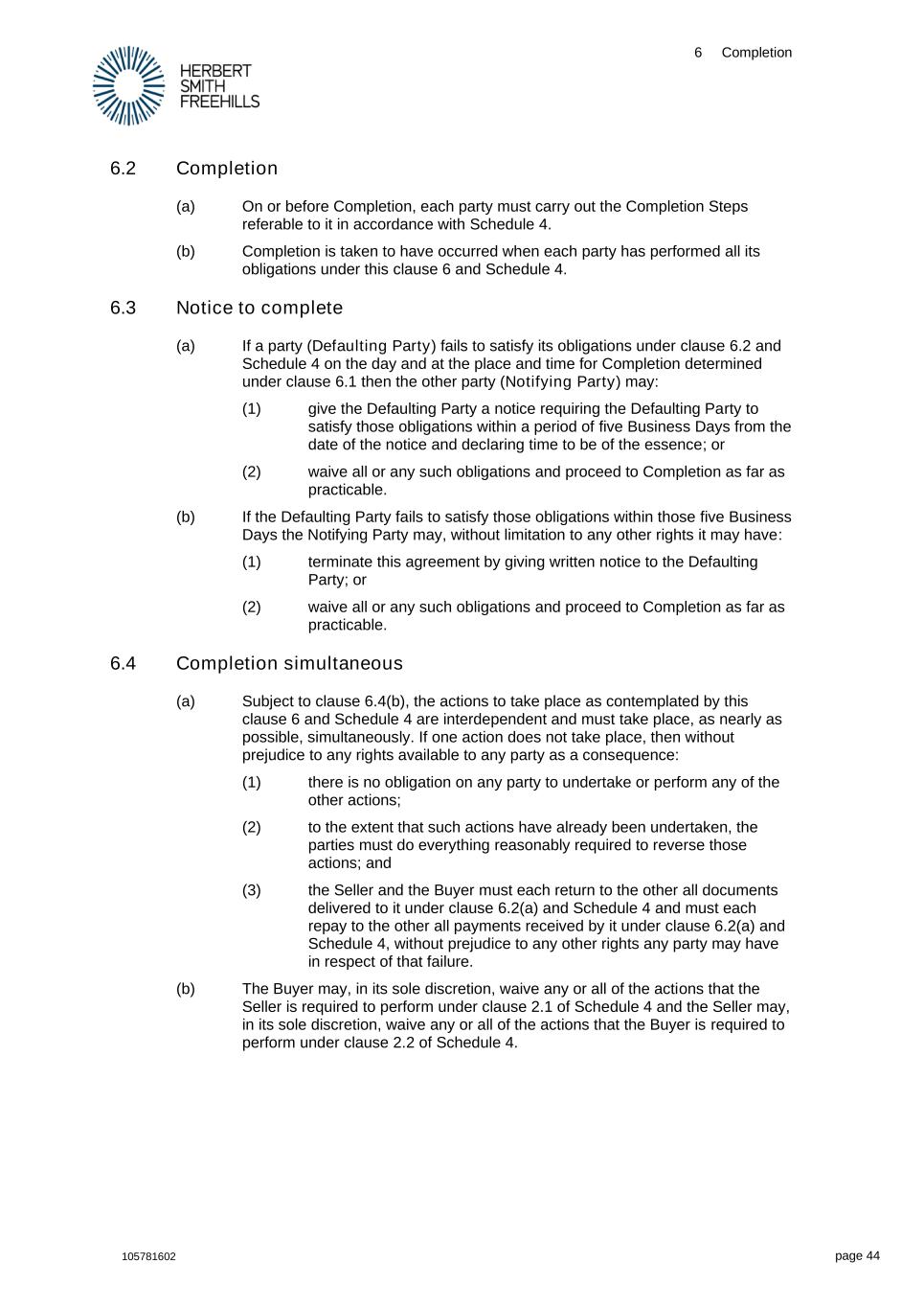 6 Completion 105781602 page 44 6.2 Completion (a) On or before Completion, each party must carry out the Completion Steps referable to it in accordance with Schedule 4. (b) Completion is taken to have occurred when each party has performed all its obligations under this clause 6 and Schedule 4. 6.3 Notice to complete (a) If a party (Defaulting Party) fails to satisfy its obligations under clause 6.2 and Schedule 4 on the day and at the place and time for Completion determined under clause 6.1 then the other party (Notifying Party) may: (1) give the Defaulting Party a notice requiring the Defaulting Party to satisfy those obligations within a period of five Business Days from the date of the notice and declaring time to be of the essence; or (2) waive all or any such obligations and proceed to Completion as far as practicable. (b) If the Defaulting Party fails to satisfy those obligations within those five Business Days the Notifying Party may, without limitation to any other rights it may have: (1) terminate this agreement by giving written notice to the Defaulting Party; or (2) waive all or any such obligations and proceed to Completion as far as practicable. 6.4 Completion simultaneous (a) Subject to clause 6.4(b), the actions to take place as contemplated by this clause 6 and Schedule 4 are interdependent and must take place, as nearly as possible, simultaneously. If one action does not take place, then without prejudice to any rights available to any party as a consequence: (1) there is no obligation on any party to undertake or perform any of the other actions; (2) to the extent that such actions have already been undertaken, the parties must do everything reasonably required to reverse those actions; and (3) the Seller and the Buyer must each return to the other all documents delivered to it under clause 6.2(a) and Schedule 4 and must each repay to the other all payments received by it under clause 6.2(a) and Schedule 4, without prejudice to any other rights any party may have in respect of that failure. (b) The Buyer may, in its sole discretion, waive any or all of the actions that the Seller is required to perform under clause 2.1 of Schedule 4 and the Seller may, in its sole discretion, waive any or all of the actions that the Buyer is required to perform under clause 2.2 of Schedule 4.