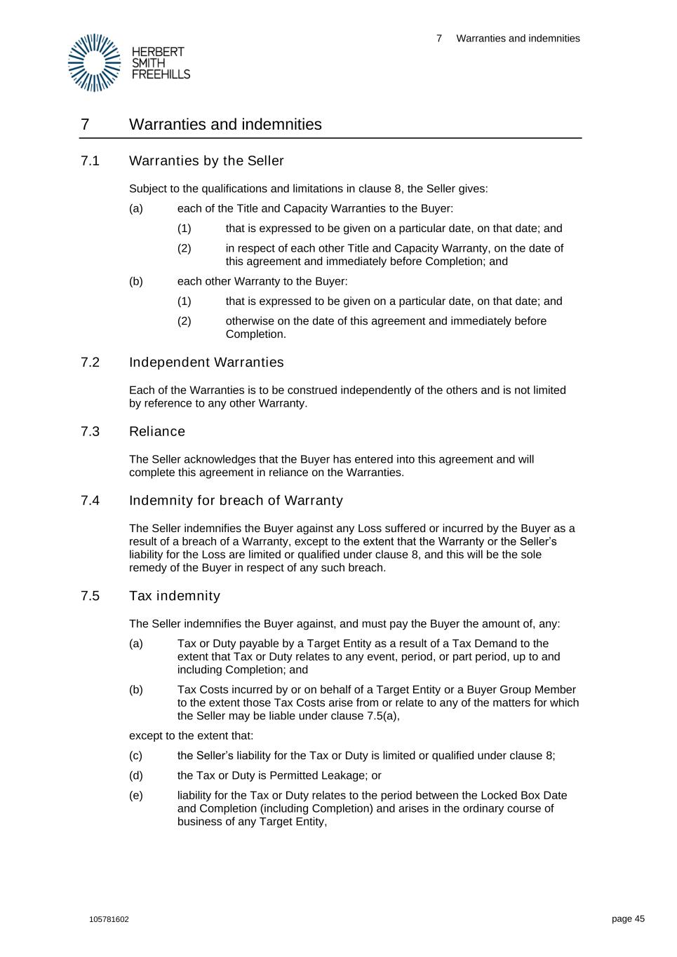 7 Warranties and indemnities 105781602 page 45 7 Warranties and indemnities 7.1 Warranties by the Seller Subject to the qualifications and limitations in clause 8, the Seller gives: (a) each of the Title and Capacity Warranties to the Buyer: (1) that is expressed to be given on a particular date, on that date; and (2) in respect of each other Title and Capacity Warranty, on the date of this agreement and immediately before Completion; and (b) each other Warranty to the Buyer: (1) that is expressed to be given on a particular date, on that date; and (2) otherwise on the date of this agreement and immediately before Completion. 7.2 Independent Warranties Each of the Warranties is to be construed independently of the others and is not limited by reference to any other Warranty. 7.3 Reliance The Seller acknowledges that the Buyer has entered into this agreement and will complete this agreement in reliance on the Warranties. 7.4 Indemnity for breach of Warranty The Seller indemnifies the Buyer against any Loss suffered or incurred by the Buyer as a result of a breach of a Warranty, except to the extent that the Warranty or the Seller’s liability for the Loss are limited or qualified under clause 8, and this will be the sole remedy of the Buyer in respect of any such breach. 7.5 Tax indemnity The Seller indemnifies the Buyer against, and must pay the Buyer the amount of, any: (a) Tax or Duty payable by a Target Entity as a result of a Tax Demand to the extent that Tax or Duty relates to any event, period, or part period, up to and including Completion; and (b) Tax Costs incurred by or on behalf of a Target Entity or a Buyer Group Member to the extent those Tax Costs arise from or relate to any of the matters for which the Seller may be liable under clause 7.5(a), except to the extent that: (c) the Seller’s liability for the Tax or Duty is limited or qualified under clause 8; (d) the Tax or Duty is Permitted Leakage; or (e) liability for the Tax or Duty relates to the period between the Locked Box Date and Completion (including Completion) and arises in the ordinary course of business of any Target Entity,