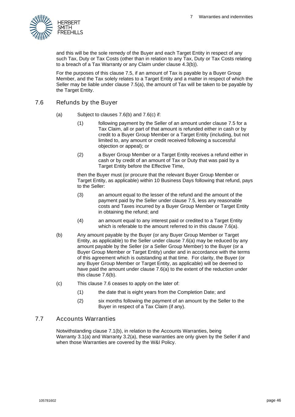 7 Warranties and indemnities 105781602 page 46 and this will be the sole remedy of the Buyer and each Target Entity in respect of any such Tax, Duty or Tax Costs (other than in relation to any Tax, Duty or Tax Costs relating to a breach of a Tax Warranty or any Claim under clause 4.3(b)). For the purposes of this clause 7.5, if an amount of Tax is payable by a Buyer Group Member, and the Tax solely relates to a Target Entity and a matter in respect of which the Seller may be liable under clause 7.5(a), the amount of Tax will be taken to be payable by the Target Entity. 7.6 Refunds by the Buyer (a) Subject to clauses 7.6(b) and 7.6(c) if: (1) following payment by the Seller of an amount under clause 7.5 for a Tax Claim, all or part of that amount is refunded either in cash or by credit to a Buyer Group Member or a Target Entity (including, but not limited to, any amount or credit received following a successful objection or appeal); or (2) a Buyer Group Member or a Target Entity receives a refund either in cash or by credit of an amount of Tax or Duty that was paid by a Target Entity before the Effective Time, then the Buyer must (or procure that the relevant Buyer Group Member or Target Entity, as applicable) within 10 Business Days following that refund, pays to the Seller: (3) an amount equal to the lesser of the refund and the amount of the payment paid by the Seller under clause 7.5, less any reasonable costs and Taxes incurred by a Buyer Group Member or Target Entity in obtaining the refund; and (4) an amount equal to any interest paid or credited to a Target Entity which is referable to the amount referred to in this clause 7.6(a). (b) Any amount payable by the Buyer (or any Buyer Group Member or Target Entity, as applicable) to the Seller under clause 7.6(a) may be reduced by any amount payable by the Seller (or a Seller Group Member) to the Buyer (or a Buyer Group Member or Target Entity) under and in accordance with the terms of this agreement which is outstanding at that time. For clarity, the Buyer (or any Buyer Group Member or Target Entity, as applicable) will be deemed to have paid the amount under clause 7.6(a) to the extent of the reduction under this clause 7.6(b). (c) This clause 7.6 ceases to apply on the later of: (1) the date that is eight years from the Completion Date; and (2) six months following the payment of an amount by the Seller to the Buyer in respect of a Tax Claim (if any). 7.7 Accounts Warranties Notwithstanding clause 7.1(b), in relation to the Accounts Warranties, being Warranty 3.1(a) and Warranty 3.2(a), these warranties are only given by the Seller if and when those Warranties are covered by the W&I Policy.