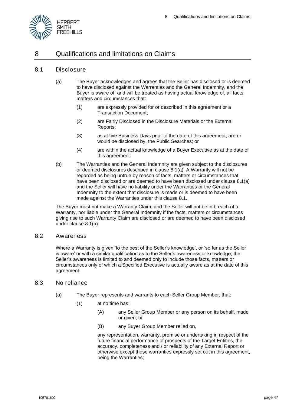 8 Qualifications and limitations on Claims 105781602 page 47 8 Qualifications and limitations on Claims 8.1 Disclosure (a) The Buyer acknowledges and agrees that the Seller has disclosed or is deemed to have disclosed against the Warranties and the General Indemnity, and the Buyer is aware of, and will be treated as having actual knowledge of, all facts, matters and circumstances that: (1) are expressly provided for or described in this agreement or a Transaction Document; (2) are Fairly Disclosed in the Disclosure Materials or the External Reports; (3) as at five Business Days prior to the date of this agreement, are or would be disclosed by, the Public Searches; or (4) are within the actual knowledge of a Buyer Executive as at the date of this agreement. (b) The Warranties and the General Indemnity are given subject to the disclosures or deemed disclosures described in clause 8.1(a). A Warranty will not be regarded as being untrue by reason of facts, matters or circumstances that have been disclosed or are deemed to have been disclosed under clause 8.1(a) and the Seller will have no liability under the Warranties or the General Indemnity to the extent that disclosure is made or is deemed to have been made against the Warranties under this clause 8.1. The Buyer must not make a Warranty Claim, and the Seller will not be in breach of a Warranty, nor liable under the General Indemnity if the facts, matters or circumstances giving rise to such Warranty Claim are disclosed or are deemed to have been disclosed under clause 8.1(a). 8.2 Awareness Where a Warranty is given ‘to the best of the Seller’s knowledge’, or ‘so far as the Seller is aware’ or with a similar qualification as to the Seller’s awareness or knowledge, the Seller’s awareness is limited to and deemed only to include those facts, matters or circumstances only of which a Specified Executive is actually aware as at the date of this agreement. 8.3 No reliance (a) The Buyer represents and warrants to each Seller Group Member, that: (1) at no time has: (A) any Seller Group Member or any person on its behalf, made or given; or (B) any Buyer Group Member relied on, any representation, warranty, promise or undertaking in respect of the future financial performance of prospects of the Target Entities, the accuracy, completeness and / or reliability of any External Report or otherwise except those warranties expressly set out in this agreement, being the Warranties;