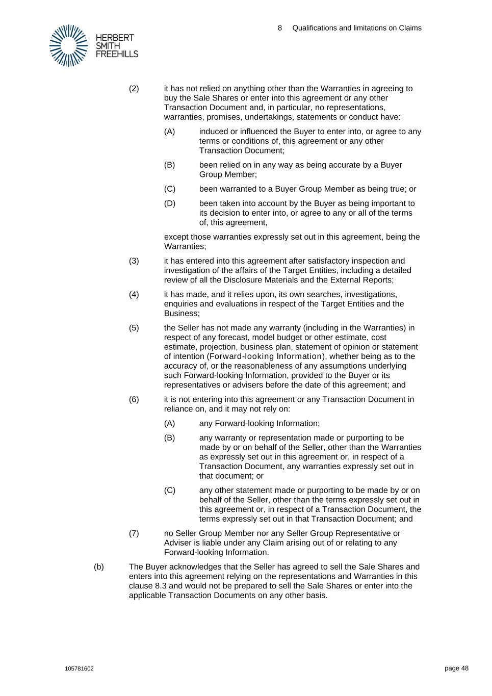8 Qualifications and limitations on Claims 105781602 page 48 (2) it has not relied on anything other than the Warranties in agreeing to buy the Sale Shares or enter into this agreement or any other Transaction Document and, in particular, no representations, warranties, promises, undertakings, statements or conduct have: (A) induced or influenced the Buyer to enter into, or agree to any terms or conditions of, this agreement or any other Transaction Document; (B) been relied on in any way as being accurate by a Buyer Group Member; (C) been warranted to a Buyer Group Member as being true; or (D) been taken into account by the Buyer as being important to its decision to enter into, or agree to any or all of the terms of, this agreement, except those warranties expressly set out in this agreement, being the Warranties; (3) it has entered into this agreement after satisfactory inspection and investigation of the affairs of the Target Entities, including a detailed review of all the Disclosure Materials and the External Reports; (4) it has made, and it relies upon, its own searches, investigations, enquiries and evaluations in respect of the Target Entities and the Business; (5) the Seller has not made any warranty (including in the Warranties) in respect of any forecast, model budget or other estimate, cost estimate, projection, business plan, statement of opinion or statement of intention (Forward-looking Information), whether being as to the accuracy of, or the reasonableness of any assumptions underlying such Forward-looking Information, provided to the Buyer or its representatives or advisers before the date of this agreement; and (6) it is not entering into this agreement or any Transaction Document in reliance on, and it may not rely on: (A) any Forward-looking Information; (B) any warranty or representation made or purporting to be made by or on behalf of the Seller, other than the Warranties as expressly set out in this agreement or, in respect of a Transaction Document, any warranties expressly set out in that document; or (C) any other statement made or purporting to be made by or on behalf of the Seller, other than the terms expressly set out in this agreement or, in respect of a Transaction Document, the terms expressly set out in that Transaction Document; and (7) no Seller Group Member nor any Seller Group Representative or Adviser is liable under any Claim arising out of or relating to any Forward-looking Information. (b) The Buyer acknowledges that the Seller has agreed to sell the Sale Shares and enters into this agreement relying on the representations and Warranties in this clause 8.3 and would not be prepared to sell the Sale Shares or enter into the applicable Transaction Documents on any other basis.