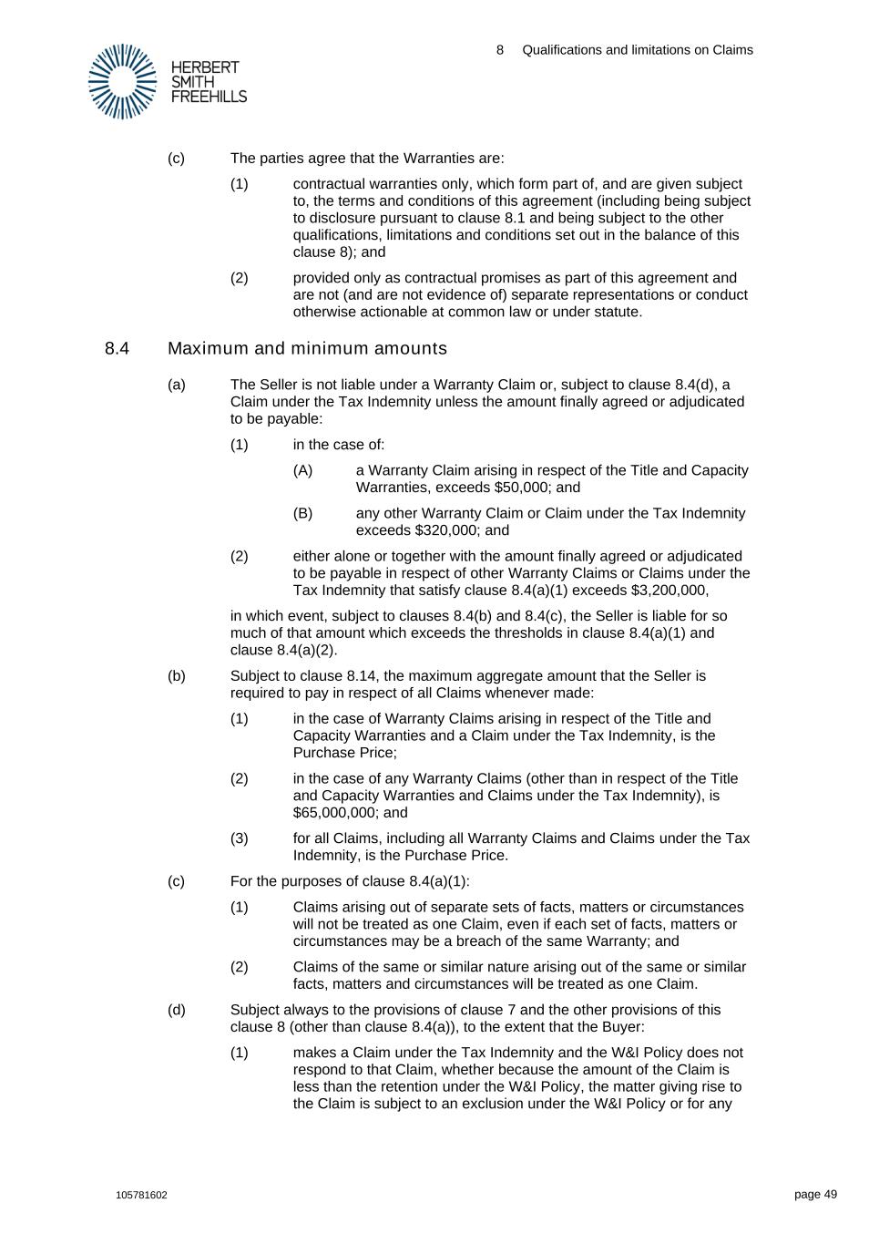 8 Qualifications and limitations on Claims 105781602 page 49 (c) The parties agree that the Warranties are: (1) contractual warranties only, which form part of, and are given subject to, the terms and conditions of this agreement (including being subject to disclosure pursuant to clause 8.1 and being subject to the other qualifications, limitations and conditions set out in the balance of this clause 8); and (2) provided only as contractual promises as part of this agreement and are not (and are not evidence of) separate representations or conduct otherwise actionable at common law or under statute. 8.4 Maximum and minimum amounts (a) The Seller is not liable under a Warranty Claim or, subject to clause 8.4(d), a Claim under the Tax Indemnity unless the amount finally agreed or adjudicated to be payable: (1) in the case of: (A) a Warranty Claim arising in respect of the Title and Capacity Warranties, exceeds $50,000; and (B) any other Warranty Claim or Claim under the Tax Indemnity exceeds $320,000; and (2) either alone or together with the amount finally agreed or adjudicated to be payable in respect of other Warranty Claims or Claims under the Tax Indemnity that satisfy clause 8.4(a)(1) exceeds $3,200,000, in which event, subject to clauses 8.4(b) and 8.4(c), the Seller is liable for so much of that amount which exceeds the thresholds in clause 8.4(a)(1) and clause 8.4(a)(2). (b) Subject to clause 8.14, the maximum aggregate amount that the Seller is required to pay in respect of all Claims whenever made: (1) in the case of Warranty Claims arising in respect of the Title and Capacity Warranties and a Claim under the Tax Indemnity, is the Purchase Price; (2) in the case of any Warranty Claims (other than in respect of the Title and Capacity Warranties and Claims under the Tax Indemnity), is $65,000,000; and (3) for all Claims, including all Warranty Claims and Claims under the Tax Indemnity, is the Purchase Price. (c) For the purposes of clause 8.4(a)(1): (1) Claims arising out of separate sets of facts, matters or circumstances will not be treated as one Claim, even if each set of facts, matters or circumstances may be a breach of the same Warranty; and (2) Claims of the same or similar nature arising out of the same or similar facts, matters and circumstances will be treated as one Claim. (d) Subject always to the provisions of clause 7 and the other provisions of this clause 8 (other than clause 8.4(a)), to the extent that the Buyer: (1) makes a Claim under the Tax Indemnity and the W&I Policy does not respond to that Claim, whether because the amount of the Claim is less than the retention under the W&I Policy, the matter giving rise to the Claim is subject to an exclusion under the W&I Policy or for any