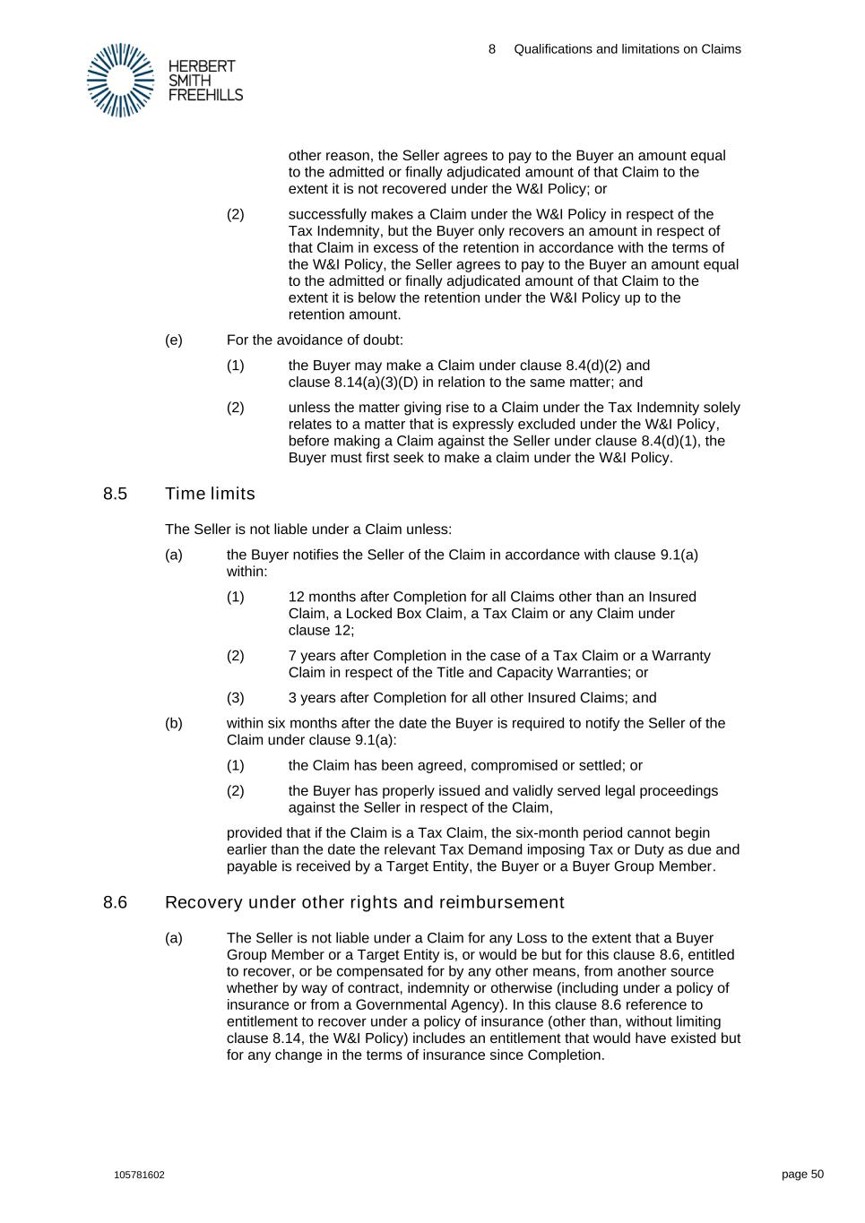 8 Qualifications and limitations on Claims 105781602 page 50 other reason, the Seller agrees to pay to the Buyer an amount equal to the admitted or finally adjudicated amount of that Claim to the extent it is not recovered under the W&I Policy; or (2) successfully makes a Claim under the W&I Policy in respect of the Tax Indemnity, but the Buyer only recovers an amount in respect of that Claim in excess of the retention in accordance with the terms of the W&I Policy, the Seller agrees to pay to the Buyer an amount equal to the admitted or finally adjudicated amount of that Claim to the extent it is below the retention under the W&I Policy up to the retention amount. (e) For the avoidance of doubt: (1) the Buyer may make a Claim under clause 8.4(d)(2) and clause 8.14(a)(3)(D) in relation to the same matter; and (2) unless the matter giving rise to a Claim under the Tax Indemnity solely relates to a matter that is expressly excluded under the W&I Policy, before making a Claim against the Seller under clause 8.4(d)(1), the Buyer must first seek to make a claim under the W&I Policy. 8.5 Time limits The Seller is not liable under a Claim unless: (a) the Buyer notifies the Seller of the Claim in accordance with clause 9.1(a) within: (1) 12 months after Completion for all Claims other than an Insured Claim, a Locked Box Claim, a Tax Claim or any Claim under clause 12; (2) 7 years after Completion in the case of a Tax Claim or a Warranty Claim in respect of the Title and Capacity Warranties; or (3) 3 years after Completion for all other Insured Claims; and (b) within six months after the date the Buyer is required to notify the Seller of the Claim under clause 9.1(a): (1) the Claim has been agreed, compromised or settled; or (2) the Buyer has properly issued and validly served legal proceedings against the Seller in respect of the Claim, provided that if the Claim is a Tax Claim, the six-month period cannot begin earlier than the date the relevant Tax Demand imposing Tax or Duty as due and payable is received by a Target Entity, the Buyer or a Buyer Group Member. 8.6 Recovery under other rights and reimbursement (a) The Seller is not liable under a Claim for any Loss to the extent that a Buyer Group Member or a Target Entity is, or would be but for this clause 8.6, entitled to recover, or be compensated for by any other means, from another source whether by way of contract, indemnity or otherwise (including under a policy of insurance or from a Governmental Agency). In this clause 8.6 reference to entitlement to recover under a policy of insurance (other than, without limiting clause 8.14, the W&I Policy) includes an entitlement that would have existed but for any change in the terms of insurance since Completion.
