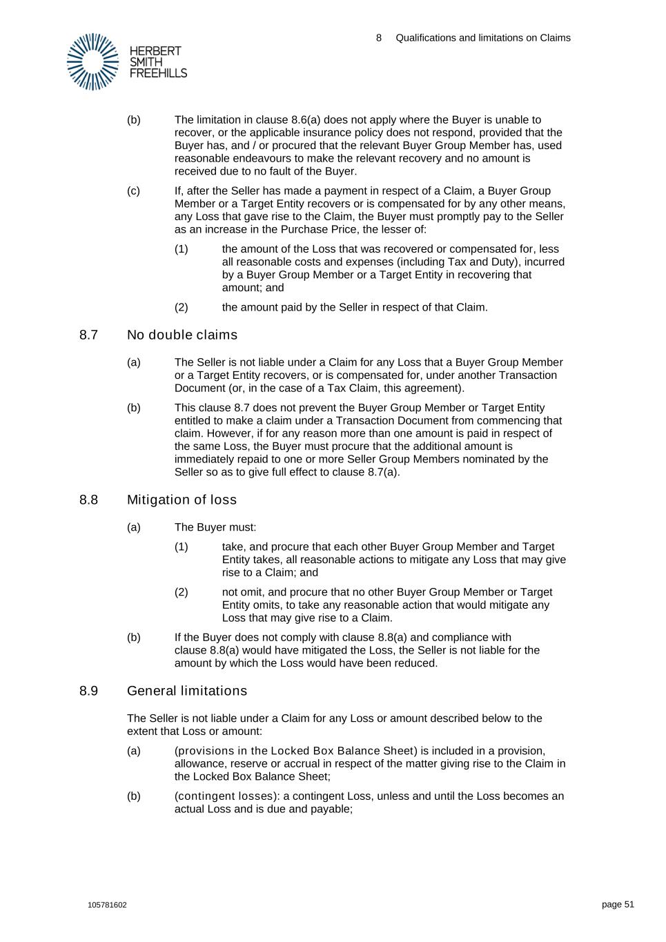 8 Qualifications and limitations on Claims 105781602 page 51 (b) The limitation in clause 8.6(a) does not apply where the Buyer is unable to recover, or the applicable insurance policy does not respond, provided that the Buyer has, and / or procured that the relevant Buyer Group Member has, used reasonable endeavours to make the relevant recovery and no amount is received due to no fault of the Buyer. (c) If, after the Seller has made a payment in respect of a Claim, a Buyer Group Member or a Target Entity recovers or is compensated for by any other means, any Loss that gave rise to the Claim, the Buyer must promptly pay to the Seller as an increase in the Purchase Price, the lesser of: (1) the amount of the Loss that was recovered or compensated for, less all reasonable costs and expenses (including Tax and Duty), incurred by a Buyer Group Member or a Target Entity in recovering that amount; and (2) the amount paid by the Seller in respect of that Claim. 8.7 No double claims (a) The Seller is not liable under a Claim for any Loss that a Buyer Group Member or a Target Entity recovers, or is compensated for, under another Transaction Document (or, in the case of a Tax Claim, this agreement). (b) This clause 8.7 does not prevent the Buyer Group Member or Target Entity entitled to make a claim under a Transaction Document from commencing that claim. However, if for any reason more than one amount is paid in respect of the same Loss, the Buyer must procure that the additional amount is immediately repaid to one or more Seller Group Members nominated by the Seller so as to give full effect to clause 8.7(a). 8.8 Mitigation of loss (a) The Buyer must: (1) take, and procure that each other Buyer Group Member and Target Entity takes, all reasonable actions to mitigate any Loss that may give rise to a Claim; and (2) not omit, and procure that no other Buyer Group Member or Target Entity omits, to take any reasonable action that would mitigate any Loss that may give rise to a Claim. (b) If the Buyer does not comply with clause 8.8(a) and compliance with clause 8.8(a) would have mitigated the Loss, the Seller is not liable for the amount by which the Loss would have been reduced. 8.9 General limitations The Seller is not liable under a Claim for any Loss or amount described below to the extent that Loss or amount: (a) (provisions in the Locked Box Balance Sheet) is included in a provision, allowance, reserve or accrual in respect of the matter giving rise to the Claim in the Locked Box Balance Sheet; (b) (contingent losses): a contingent Loss, unless and until the Loss becomes an actual Loss and is due and payable;