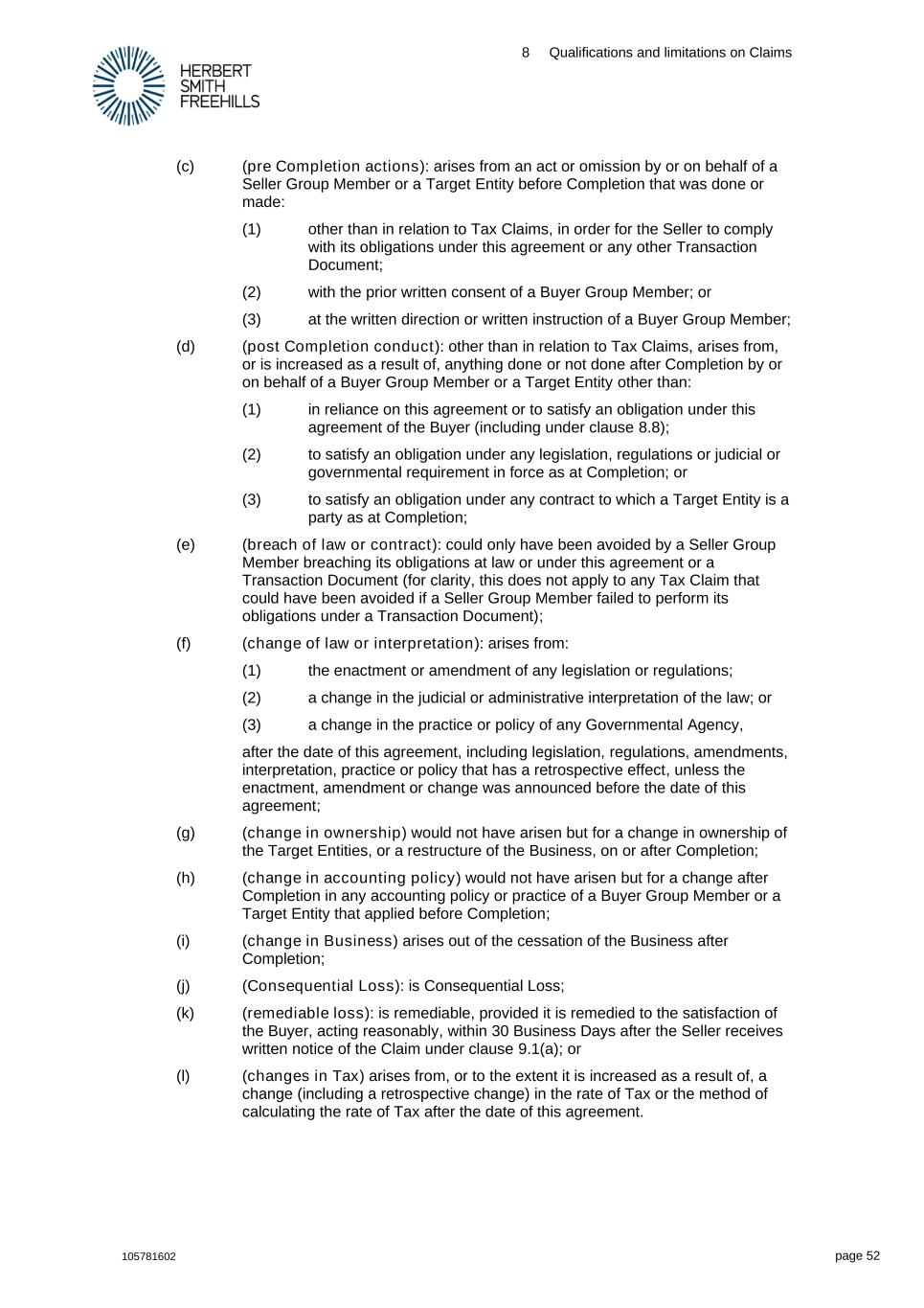 8 Qualifications and limitations on Claims 105781602 page 52 (c) (pre Completion actions): arises from an act or omission by or on behalf of a Seller Group Member or a Target Entity before Completion that was done or made: (1) other than in relation to Tax Claims, in order for the Seller to comply with its obligations under this agreement or any other Transaction Document; (2) with the prior written consent of a Buyer Group Member; or (3) at the written direction or written instruction of a Buyer Group Member; (d) (post Completion conduct): other than in relation to Tax Claims, arises from, or is increased as a result of, anything done or not done after Completion by or on behalf of a Buyer Group Member or a Target Entity other than: (1) in reliance on this agreement or to satisfy an obligation under this agreement of the Buyer (including under clause 8.8); (2) to satisfy an obligation under any legislation, regulations or judicial or governmental requirement in force as at Completion; or (3) to satisfy an obligation under any contract to which a Target Entity is a party as at Completion; (e) (breach of law or contract): could only have been avoided by a Seller Group Member breaching its obligations at law or under this agreement or a Transaction Document (for clarity, this does not apply to any Tax Claim that could have been avoided if a Seller Group Member failed to perform its obligations under a Transaction Document); (f) (change of law or interpretation): arises from: (1) the enactment or amendment of any legislation or regulations; (2) a change in the judicial or administrative interpretation of the law; or (3) a change in the practice or policy of any Governmental Agency, after the date of this agreement, including legislation, regulations, amendments, interpretation, practice or policy that has a retrospective effect, unless the enactment, amendment or change was announced before the date of this agreement; (g) (change in ownership) would not have arisen but for a change in ownership of the Target Entities, or a restructure of the Business, on or after Completion; (h) (change in accounting policy) would not have arisen but for a change after Completion in any accounting policy or practice of a Buyer Group Member or a Target Entity that applied before Completion; (i) (change in Business) arises out of the cessation of the Business after Completion; (j) (Consequential Loss): is Consequential Loss; (k) (remediable loss): is remediable, provided it is remedied to the satisfaction of the Buyer, acting reasonably, within 30 Business Days after the Seller receives written notice of the Claim under clause 9.1(a); or (l) (changes in Tax) arises from, or to the extent it is increased as a result of, a change (including a retrospective change) in the rate of Tax or the method of calculating the rate of Tax after the date of this agreement.