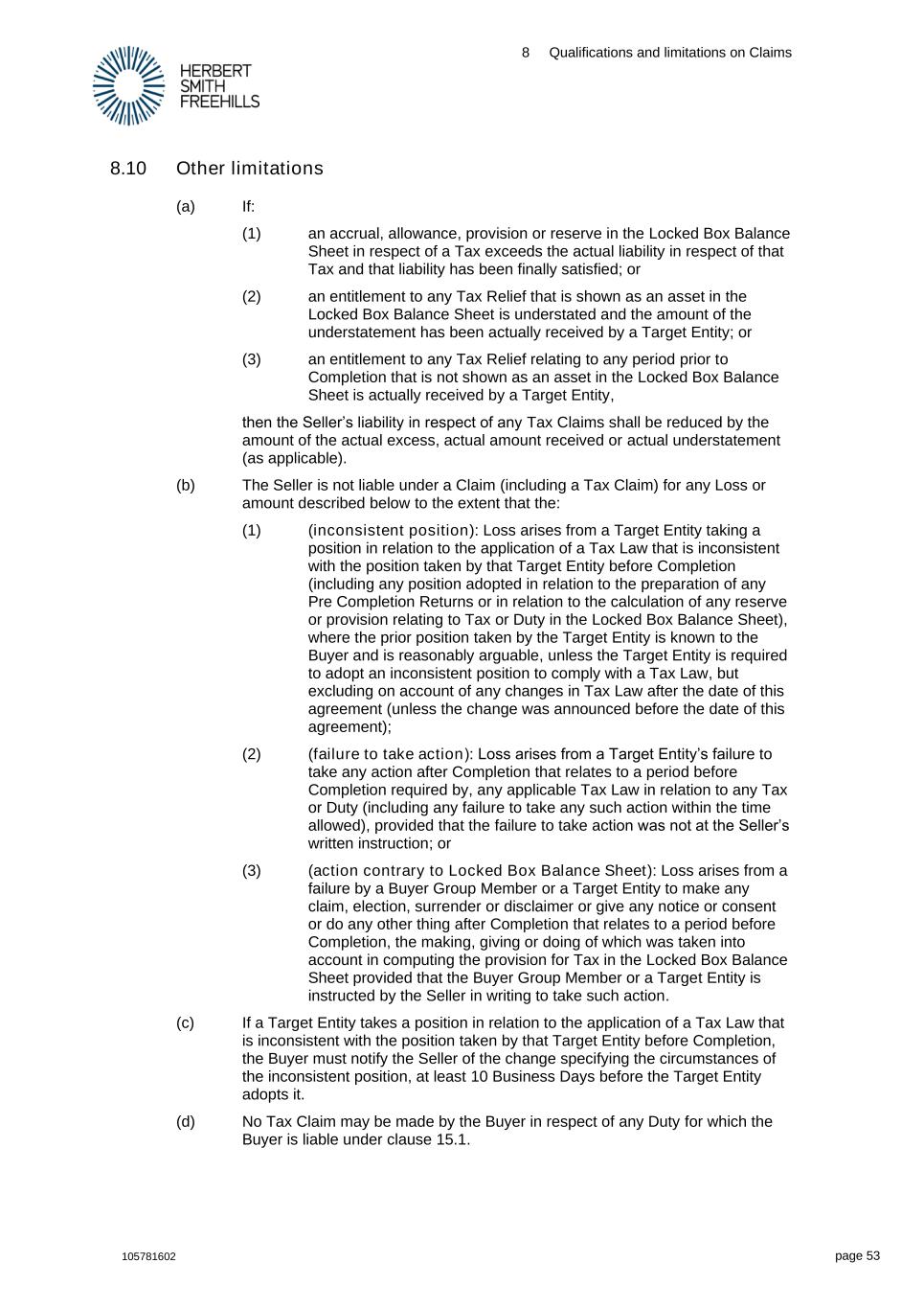8 Qualifications and limitations on Claims 105781602 page 53 8.10 Other limitations (a) If: (1) an accrual, allowance, provision or reserve in the Locked Box Balance Sheet in respect of a Tax exceeds the actual liability in respect of that Tax and that liability has been finally satisfied; or (2) an entitlement to any Tax Relief that is shown as an asset in the Locked Box Balance Sheet is understated and the amount of the understatement has been actually received by a Target Entity; or (3) an entitlement to any Tax Relief relating to any period prior to Completion that is not shown as an asset in the Locked Box Balance Sheet is actually received by a Target Entity, then the Seller’s liability in respect of any Tax Claims shall be reduced by the amount of the actual excess, actual amount received or actual understatement (as applicable). (b) The Seller is not liable under a Claim (including a Tax Claim) for any Loss or amount described below to the extent that the: (1) (inconsistent position): Loss arises from a Target Entity taking a position in relation to the application of a Tax Law that is inconsistent with the position taken by that Target Entity before Completion (including any position adopted in relation to the preparation of any Pre Completion Returns or in relation to the calculation of any reserve or provision relating to Tax or Duty in the Locked Box Balance Sheet), where the prior position taken by the Target Entity is known to the Buyer and is reasonably arguable, unless the Target Entity is required to adopt an inconsistent position to comply with a Tax Law, but excluding on account of any changes in Tax Law after the date of this agreement (unless the change was announced before the date of this agreement); (2) (failure to take action): Loss arises from a Target Entity’s failure to take any action after Completion that relates to a period before Completion required by, any applicable Tax Law in relation to any Tax or Duty (including any failure to take any such action within the time allowed), provided that the failure to take action was not at the Seller’s written instruction; or (3) (action contrary to Locked Box Balance Sheet): Loss arises from a failure by a Buyer Group Member or a Target Entity to make any claim, election, surrender or disclaimer or give any notice or consent or do any other thing after Completion that relates to a period before Completion, the making, giving or doing of which was taken into account in computing the provision for Tax in the Locked Box Balance Sheet provided that the Buyer Group Member or a Target Entity is instructed by the Seller in writing to take such action. (c) If a Target Entity takes a position in relation to the application of a Tax Law that is inconsistent with the position taken by that Target Entity before Completion, the Buyer must notify the Seller of the change specifying the circumstances of the inconsistent position, at least 10 Business Days before the Target Entity adopts it. (d) No Tax Claim may be made by the Buyer in respect of any Duty for which the Buyer is liable under clause 15.1.