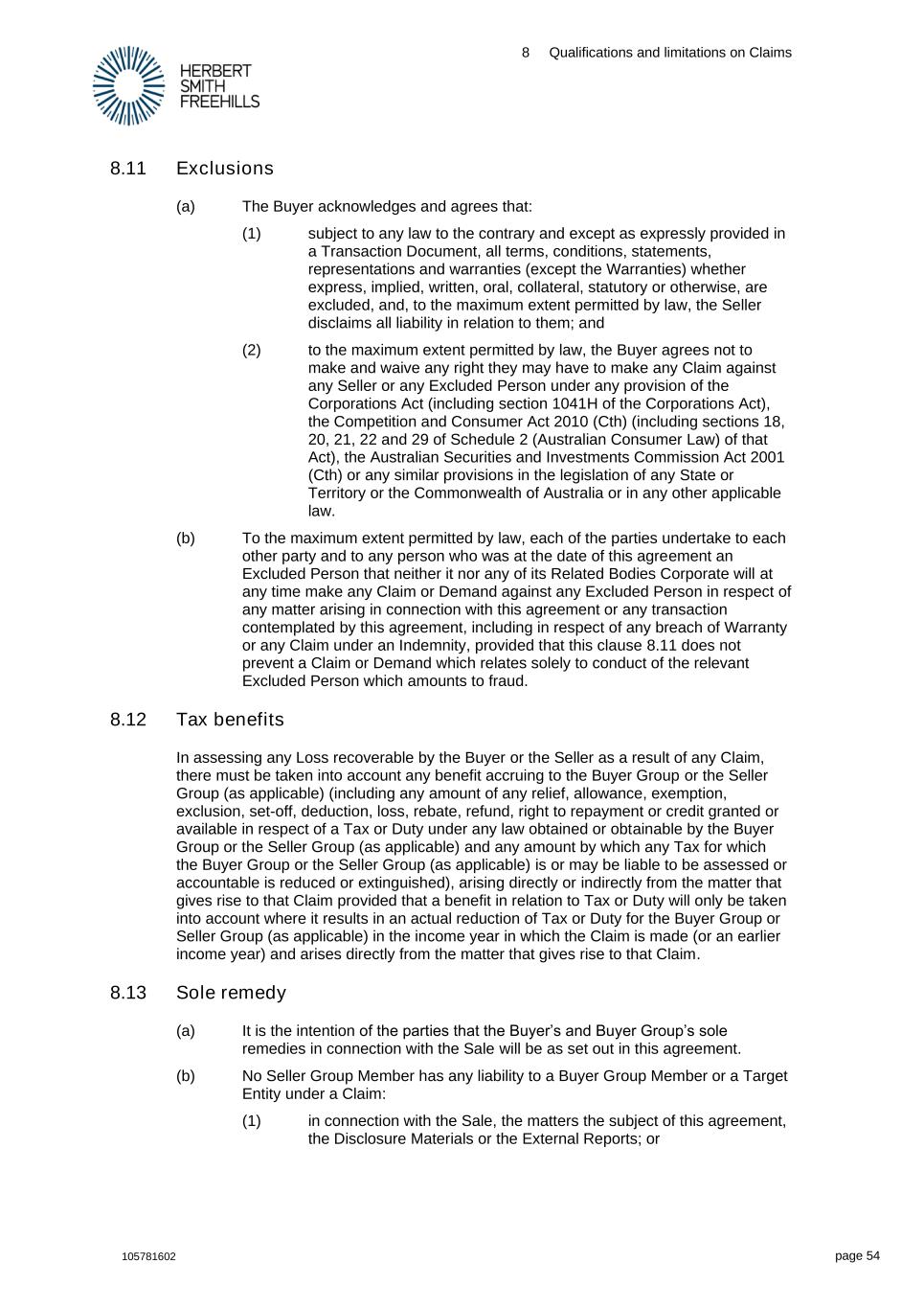 8 Qualifications and limitations on Claims 105781602 page 54 8.11 Exclusions (a) The Buyer acknowledges and agrees that: (1) subject to any law to the contrary and except as expressly provided in a Transaction Document, all terms, conditions, statements, representations and warranties (except the Warranties) whether express, implied, written, oral, collateral, statutory or otherwise, are excluded, and, to the maximum extent permitted by law, the Seller disclaims all liability in relation to them; and (2) to the maximum extent permitted by law, the Buyer agrees not to make and waive any right they may have to make any Claim against any Seller or any Excluded Person under any provision of the Corporations Act (including section 1041H of the Corporations Act), the Competition and Consumer Act 2010 (Cth) (including sections 18, 20, 21, 22 and 29 of Schedule 2 (Australian Consumer Law) of that Act), the Australian Securities and Investments Commission Act 2001 (Cth) or any similar provisions in the legislation of any State or Territory or the Commonwealth of Australia or in any other applicable law. (b) To the maximum extent permitted by law, each of the parties undertake to each other party and to any person who was at the date of this agreement an Excluded Person that neither it nor any of its Related Bodies Corporate will at any time make any Claim or Demand against any Excluded Person in respect of any matter arising in connection with this agreement or any transaction contemplated by this agreement, including in respect of any breach of Warranty or any Claim under an Indemnity, provided that this clause 8.11 does not prevent a Claim or Demand which relates solely to conduct of the relevant Excluded Person which amounts to fraud. 8.12 Tax benefits In assessing any Loss recoverable by the Buyer or the Seller as a result of any Claim, there must be taken into account any benefit accruing to the Buyer Group or the Seller Group (as applicable) (including any amount of any relief, allowance, exemption, exclusion, set-off, deduction, loss, rebate, refund, right to repayment or credit granted or available in respect of a Tax or Duty under any law obtained or obtainable by the Buyer Group or the Seller Group (as applicable) and any amount by which any Tax for which the Buyer Group or the Seller Group (as applicable) is or may be liable to be assessed or accountable is reduced or extinguished), arising directly or indirectly from the matter that gives rise to that Claim provided that a benefit in relation to Tax or Duty will only be taken into account where it results in an actual reduction of Tax or Duty for the Buyer Group or Seller Group (as applicable) in the income year in which the Claim is made (or an earlier income year) and arises directly from the matter that gives rise to that Claim. 8.13 Sole remedy (a) It is the intention of the parties that the Buyer’s and Buyer Group’s sole remedies in connection with the Sale will be as set out in this agreement. (b) No Seller Group Member has any liability to a Buyer Group Member or a Target Entity under a Claim: (1) in connection with the Sale, the matters the subject of this agreement, the Disclosure Materials or the External Reports; or