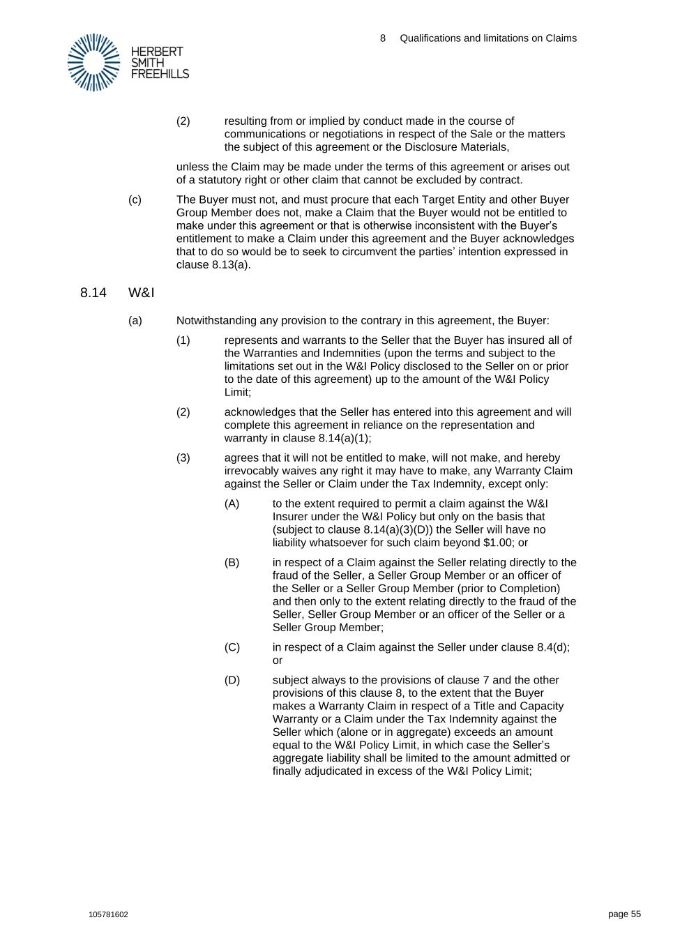 8 Qualifications and limitations on Claims 105781602 page 55 (2) resulting from or implied by conduct made in the course of communications or negotiations in respect of the Sale or the matters the subject of this agreement or the Disclosure Materials, unless the Claim may be made under the terms of this agreement or arises out of a statutory right or other claim that cannot be excluded by contract. (c) The Buyer must not, and must procure that each Target Entity and other Buyer Group Member does not, make a Claim that the Buyer would not be entitled to make under this agreement or that is otherwise inconsistent with the Buyer’s entitlement to make a Claim under this agreement and the Buyer acknowledges that to do so would be to seek to circumvent the parties’ intention expressed in clause 8.13(a). 8.14 W&I (a) Notwithstanding any provision to the contrary in this agreement, the Buyer: (1) represents and warrants to the Seller that the Buyer has insured all of the Warranties and Indemnities (upon the terms and subject to the limitations set out in the W&I Policy disclosed to the Seller on or prior to the date of this agreement) up to the amount of the W&I Policy Limit; (2) acknowledges that the Seller has entered into this agreement and will complete this agreement in reliance on the representation and warranty in clause 8.14(a)(1); (3) agrees that it will not be entitled to make, will not make, and hereby irrevocably waives any right it may have to make, any Warranty Claim against the Seller or Claim under the Tax Indemnity, except only: (A) to the extent required to permit a claim against the W&I Insurer under the W&I Policy but only on the basis that (subject to clause 8.14(a)(3)(D)) the Seller will have no liability whatsoever for such claim beyond $1.00; or (B) in respect of a Claim against the Seller relating directly to the fraud of the Seller, a Seller Group Member or an officer of the Seller or a Seller Group Member (prior to Completion) and then only to the extent relating directly to the fraud of the Seller, Seller Group Member or an officer of the Seller or a Seller Group Member; (C) in respect of a Claim against the Seller under clause 8.4(d); or (D) subject always to the provisions of clause 7 and the other provisions of this clause 8, to the extent that the Buyer makes a Warranty Claim in respect of a Title and Capacity Warranty or a Claim under the Tax Indemnity against the Seller which (alone or in aggregate) exceeds an amount equal to the W&I Policy Limit, in which case the Seller’s aggregate liability shall be limited to the amount admitted or finally adjudicated in excess of the W&I Policy Limit;