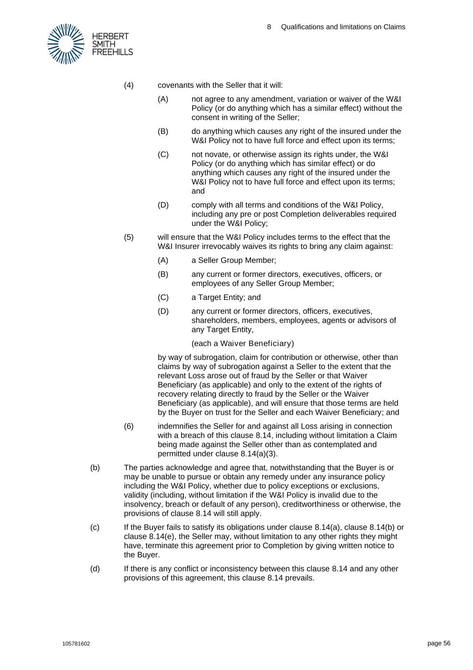 8 Qualifications and limitations on Claims 105781602 page 56 (4) covenants with the Seller that it will: (A) not agree to any amendment, variation or waiver of the W&I Policy (or do anything which has a similar effect) without the consent in writing of the Seller; (B) do anything which causes any right of the insured under the W&I Policy not to have full force and effect upon its terms; (C) not novate, or otherwise assign its rights under, the W&I Policy (or do anything which has similar effect) or do anything which causes any right of the insured under the W&I Policy not to have full force and effect upon its terms; and (D) comply with all terms and conditions of the W&I Policy, including any pre or post Completion deliverables required under the W&I Policy; (5) will ensure that the W&I Policy includes terms to the effect that the W&I Insurer irrevocably waives its rights to bring any claim against: (A) a Seller Group Member; (B) any current or former directors, executives, officers, or employees of any Seller Group Member; (C) a Target Entity; and (D) any current or former directors, officers, executives, shareholders, members, employees, agents or advisors of any Target Entity, (each a Waiver Beneficiary) by way of subrogation, claim for contribution or otherwise, other than claims by way of subrogation against a Seller to the extent that the relevant Loss arose out of fraud by the Seller or that Waiver Beneficiary (as applicable) and only to the extent of the rights of recovery relating directly to fraud by the Seller or the Waiver Beneficiary (as applicable), and will ensure that those terms are held by the Buyer on trust for the Seller and each Waiver Beneficiary; and (6) indemnifies the Seller for and against all Loss arising in connection with a breach of this clause 8.14, including without limitation a Claim being made against the Seller other than as contemplated and permitted under clause 8.14(a)(3). (b) The parties acknowledge and agree that, notwithstanding that the Buyer is or may be unable to pursue or obtain any remedy under any insurance policy including the W&I Policy, whether due to policy exceptions or exclusions, validity (including, without limitation if the W&I Policy is invalid due to the insolvency, breach or default of any person), creditworthiness or otherwise, the provisions of clause 8.14 will still apply. (c) If the Buyer fails to satisfy its obligations under clause 8.14(a), clause 8.14(b) or clause 8.14(e), the Seller may, without limitation to any other rights they might have, terminate this agreement prior to Completion by giving written notice to the Buyer. (d) If there is any conflict or inconsistency between this clause 8.14 and any other provisions of this agreement, this clause 8.14 prevails.
