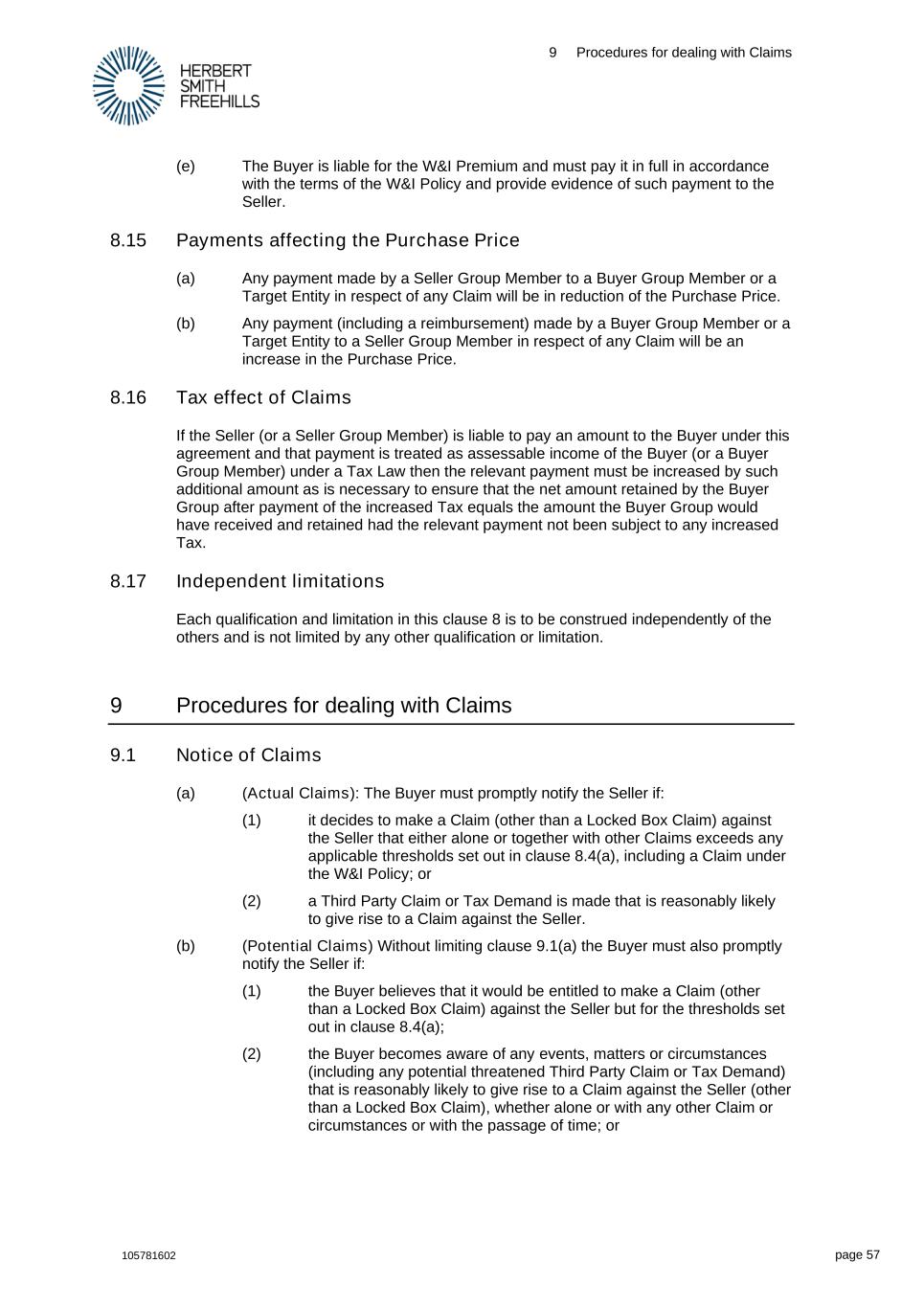9 Procedures for dealing with Claims 105781602 page 57 (e) The Buyer is liable for the W&I Premium and must pay it in full in accordance with the terms of the W&I Policy and provide evidence of such payment to the Seller. 8.15 Payments affecting the Purchase Price (a) Any payment made by a Seller Group Member to a Buyer Group Member or a Target Entity in respect of any Claim will be in reduction of the Purchase Price. (b) Any payment (including a reimbursement) made by a Buyer Group Member or a Target Entity to a Seller Group Member in respect of any Claim will be an increase in the Purchase Price. 8.16 Tax effect of Claims If the Seller (or a Seller Group Member) is liable to pay an amount to the Buyer under this agreement and that payment is treated as assessable income of the Buyer (or a Buyer Group Member) under a Tax Law then the relevant payment must be increased by such additional amount as is necessary to ensure that the net amount retained by the Buyer Group after payment of the increased Tax equals the amount the Buyer Group would have received and retained had the relevant payment not been subject to any increased Tax. 8.17 Independent limitations Each qualification and limitation in this clause 8 is to be construed independently of the others and is not limited by any other qualification or limitation. 9 Procedures for dealing with Claims 9.1 Notice of Claims (a) (Actual Claims): The Buyer must promptly notify the Seller if: (1) it decides to make a Claim (other than a Locked Box Claim) against the Seller that either alone or together with other Claims exceeds any applicable thresholds set out in clause 8.4(a), including a Claim under the W&I Policy; or (2) a Third Party Claim or Tax Demand is made that is reasonably likely to give rise to a Claim against the Seller. (b) (Potential Claims) Without limiting clause 9.1(a) the Buyer must also promptly notify the Seller if: (1) the Buyer believes that it would be entitled to make a Claim (other than a Locked Box Claim) against the Seller but for the thresholds set out in clause 8.4(a); (2) the Buyer becomes aware of any events, matters or circumstances (including any potential threatened Third Party Claim or Tax Demand) that is reasonably likely to give rise to a Claim against the Seller (other than a Locked Box Claim), whether alone or with any other Claim or circumstances or with the passage of time; or