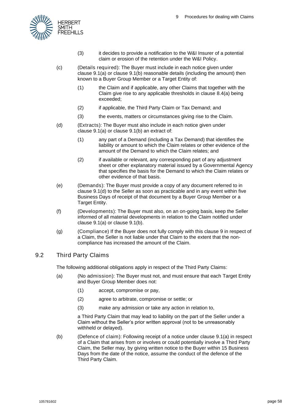 9 Procedures for dealing with Claims 105781602 page 58 (3) it decides to provide a notification to the W&I Insurer of a potential claim or erosion of the retention under the W&I Policy. (c) (Details required): The Buyer must include in each notice given under clause 9.1(a) or clause 9.1(b) reasonable details (including the amount) then known to a Buyer Group Member or a Target Entity of: (1) the Claim and if applicable, any other Claims that together with the Claim give rise to any applicable thresholds in clause 8.4(a) being exceeded; (2) if applicable, the Third Party Claim or Tax Demand; and (3) the events, matters or circumstances giving rise to the Claim. (d) (Extracts): The Buyer must also include in each notice given under clause 9.1(a) or clause 9.1(b) an extract of: (1) any part of a Demand (including a Tax Demand) that identifies the liability or amount to which the Claim relates or other evidence of the amount of the Demand to which the Claim relates; and (2) if available or relevant, any corresponding part of any adjustment sheet or other explanatory material issued by a Governmental Agency that specifies the basis for the Demand to which the Claim relates or other evidence of that basis. (e) (Demands): The Buyer must provide a copy of any document referred to in clause 9.1(d) to the Seller as soon as practicable and in any event within five Business Days of receipt of that document by a Buyer Group Member or a Target Entity. (f) (Developments): The Buyer must also, on an on-going basis, keep the Seller informed of all material developments in relation to the Claim notified under clause 9.1(a) or clause 9.1(b). (g) (Compliance) If the Buyer does not fully comply with this clause 9 in respect of a Claim, the Seller is not liable under that Claim to the extent that the non- compliance has increased the amount of the Claim. 9.2 Third Party Claims The following additional obligations apply in respect of the Third Party Claims: (a) (No admission): The Buyer must not, and must ensure that each Target Entity and Buyer Group Member does not: (1) accept, compromise or pay, (2) agree to arbitrate, compromise or settle; or (3) make any admission or take any action in relation to, a Third Party Claim that may lead to liability on the part of the Seller under a Claim without the Seller’s prior written approval (not to be unreasonably withheld or delayed). (b) (Defence of claim): Following receipt of a notice under clause 9.1(a) in respect of a Claim that arises from or involves or could potentially involve a Third Party Claim, the Seller may, by giving written notice to the Buyer within 15 Business Days from the date of the notice, assume the conduct of the defence of the Third Party Claim.