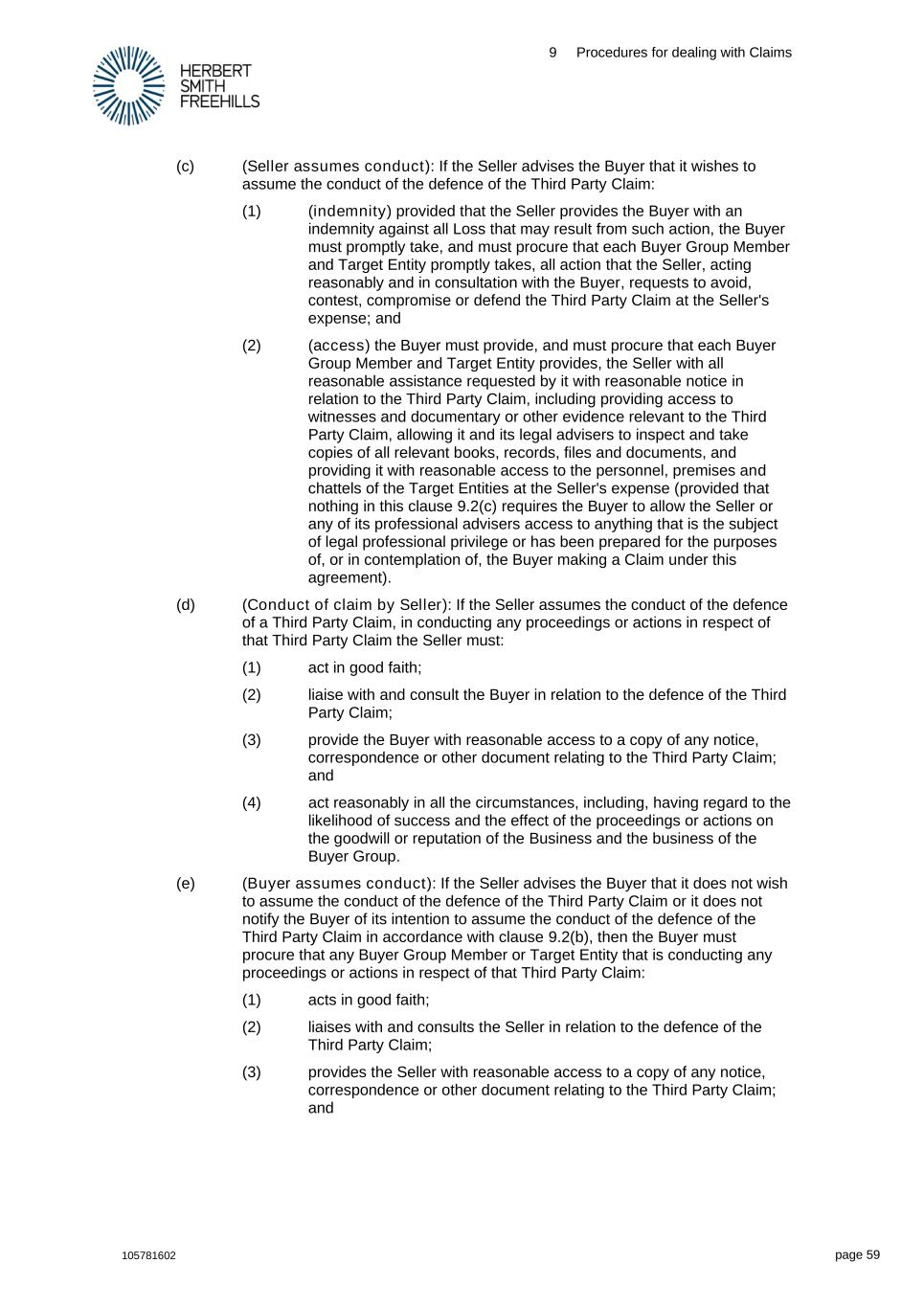 9 Procedures for dealing with Claims 105781602 page 59 (c) (Seller assumes conduct): If the Seller advises the Buyer that it wishes to assume the conduct of the defence of the Third Party Claim: (1) (indemnity) provided that the Seller provides the Buyer with an indemnity against all Loss that may result from such action, the Buyer must promptly take, and must procure that each Buyer Group Member and Target Entity promptly takes, all action that the Seller, acting reasonably and in consultation with the Buyer, requests to avoid, contest, compromise or defend the Third Party Claim at the Seller's expense; and (2) (access) the Buyer must provide, and must procure that each Buyer Group Member and Target Entity provides, the Seller with all reasonable assistance requested by it with reasonable notice in relation to the Third Party Claim, including providing access to witnesses and documentary or other evidence relevant to the Third Party Claim, allowing it and its legal advisers to inspect and take copies of all relevant books, records, files and documents, and providing it with reasonable access to the personnel, premises and chattels of the Target Entities at the Seller's expense (provided that nothing in this clause 9.2(c) requires the Buyer to allow the Seller or any of its professional advisers access to anything that is the subject of legal professional privilege or has been prepared for the purposes of, or in contemplation of, the Buyer making a Claim under this agreement). (d) (Conduct of claim by Seller): If the Seller assumes the conduct of the defence of a Third Party Claim, in conducting any proceedings or actions in respect of that Third Party Claim the Seller must: (1) act in good faith; (2) liaise with and consult the Buyer in relation to the defence of the Third Party Claim; (3) provide the Buyer with reasonable access to a copy of any notice, correspondence or other document relating to the Third Party Claim; and (4) act reasonably in all the circumstances, including, having regard to the likelihood of success and the effect of the proceedings or actions on the goodwill or reputation of the Business and the business of the Buyer Group. (e) (Buyer assumes conduct): If the Seller advises the Buyer that it does not wish to assume the conduct of the defence of the Third Party Claim or it does not notify the Buyer of its intention to assume the conduct of the defence of the Third Party Claim in accordance with clause 9.2(b), then the Buyer must procure that any Buyer Group Member or Target Entity that is conducting any proceedings or actions in respect of that Third Party Claim: (1) acts in good faith; (2) liaises with and consults the Seller in relation to the defence of the Third Party Claim; (3) provides the Seller with reasonable access to a copy of any notice, correspondence or other document relating to the Third Party Claim; and